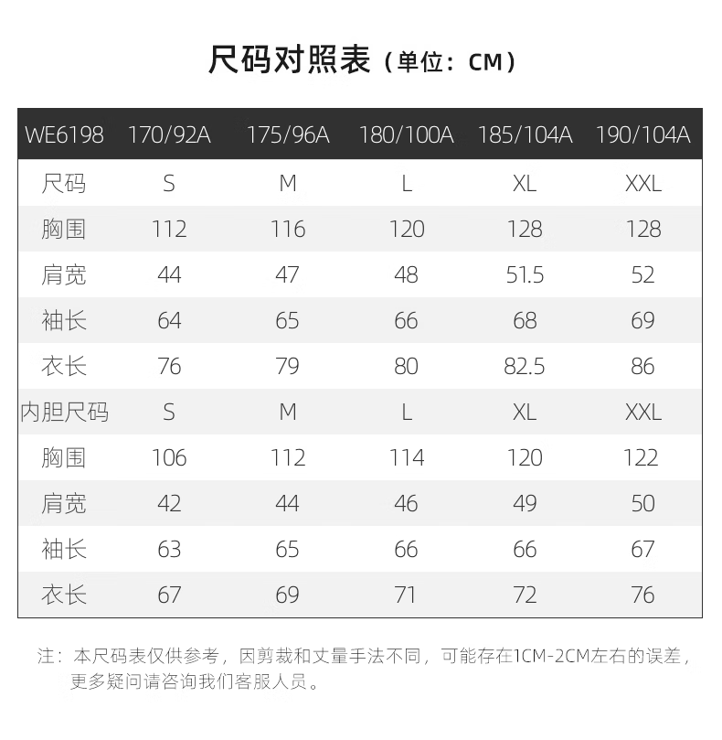 China (cm) 165 / 88-90 170 / 96-98 175 / 108-110 180 / 118-122 185 / 126-130