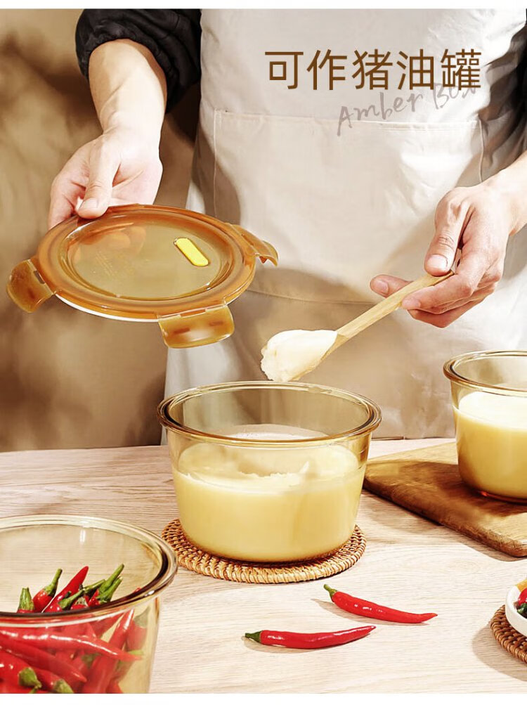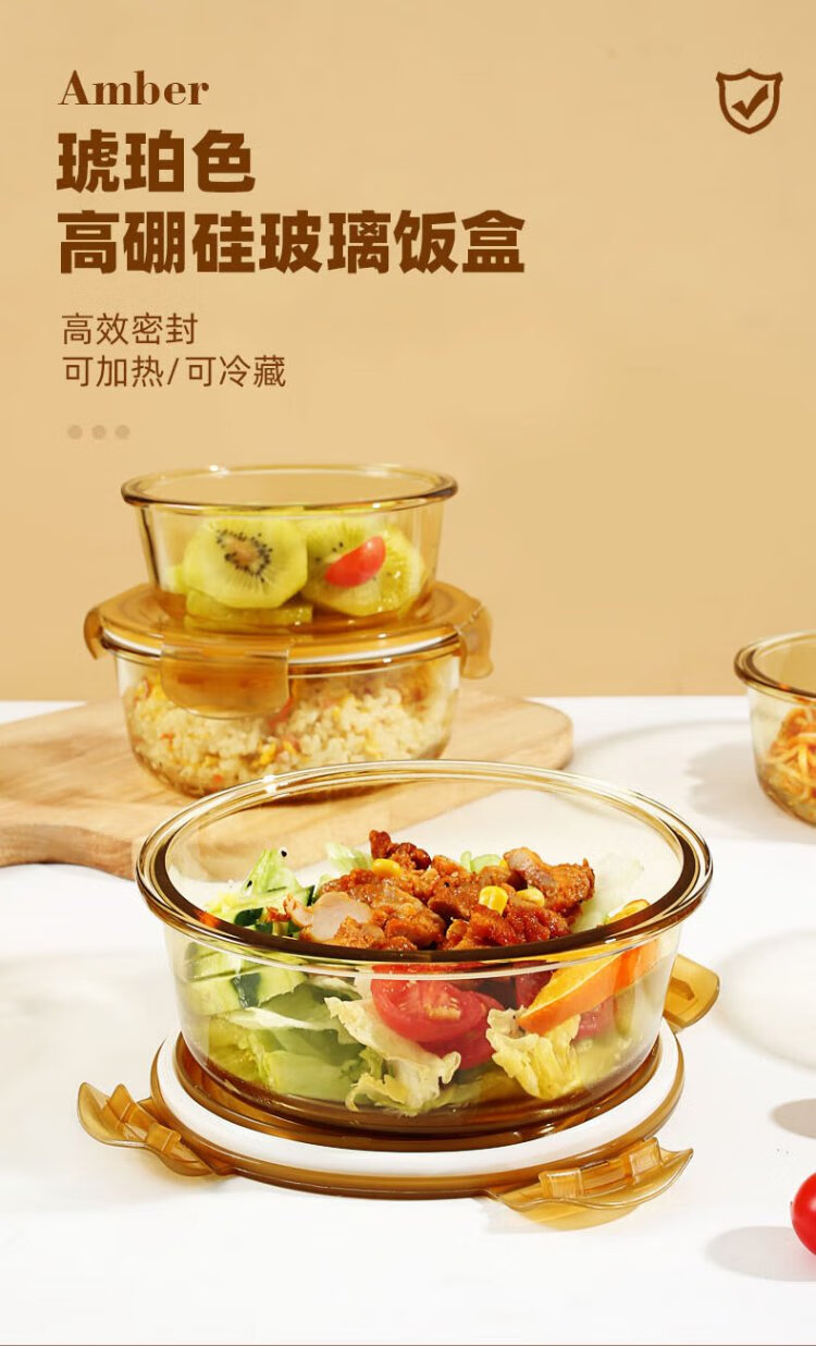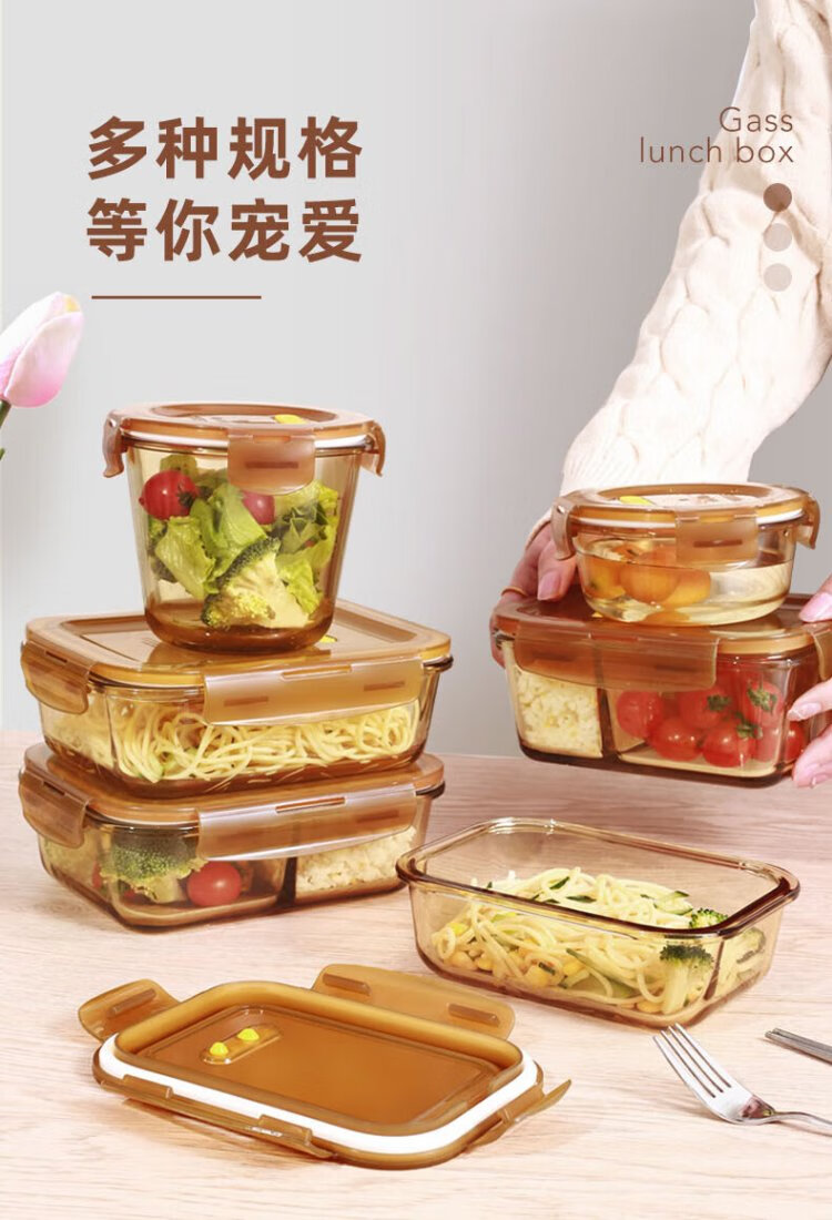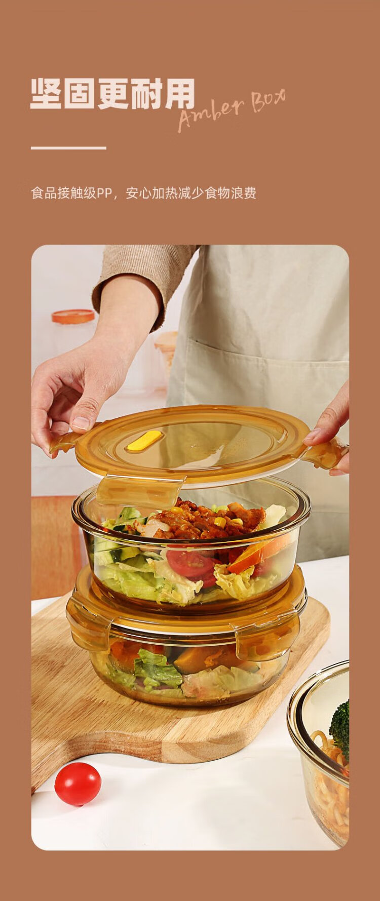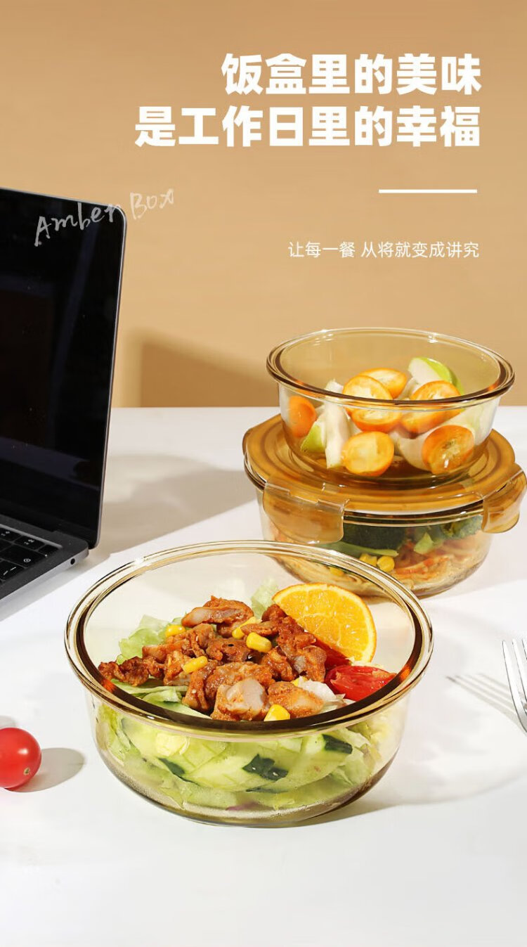 Chuangde heat-resistant glass lunch box office workers microwave lunch box crisper storage bowl lunch box compartment lunch box amber round 1050mL