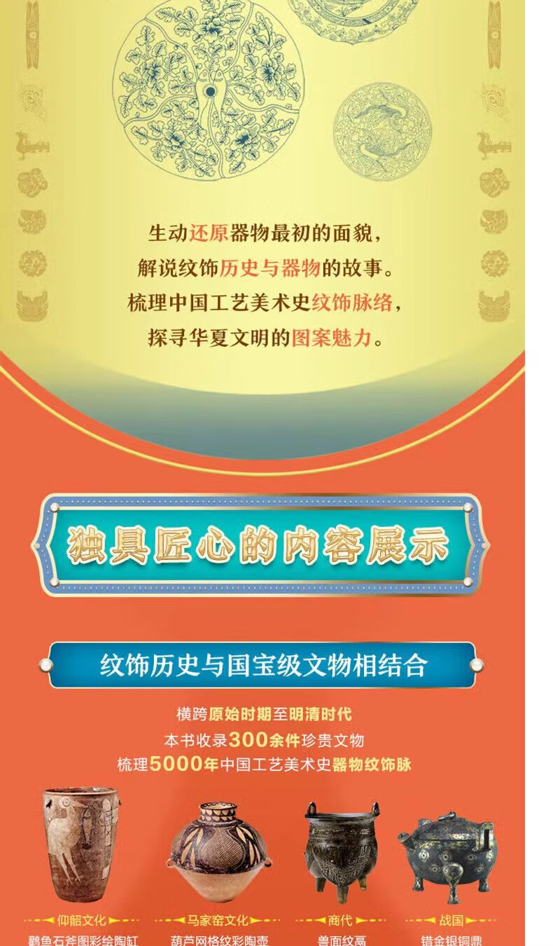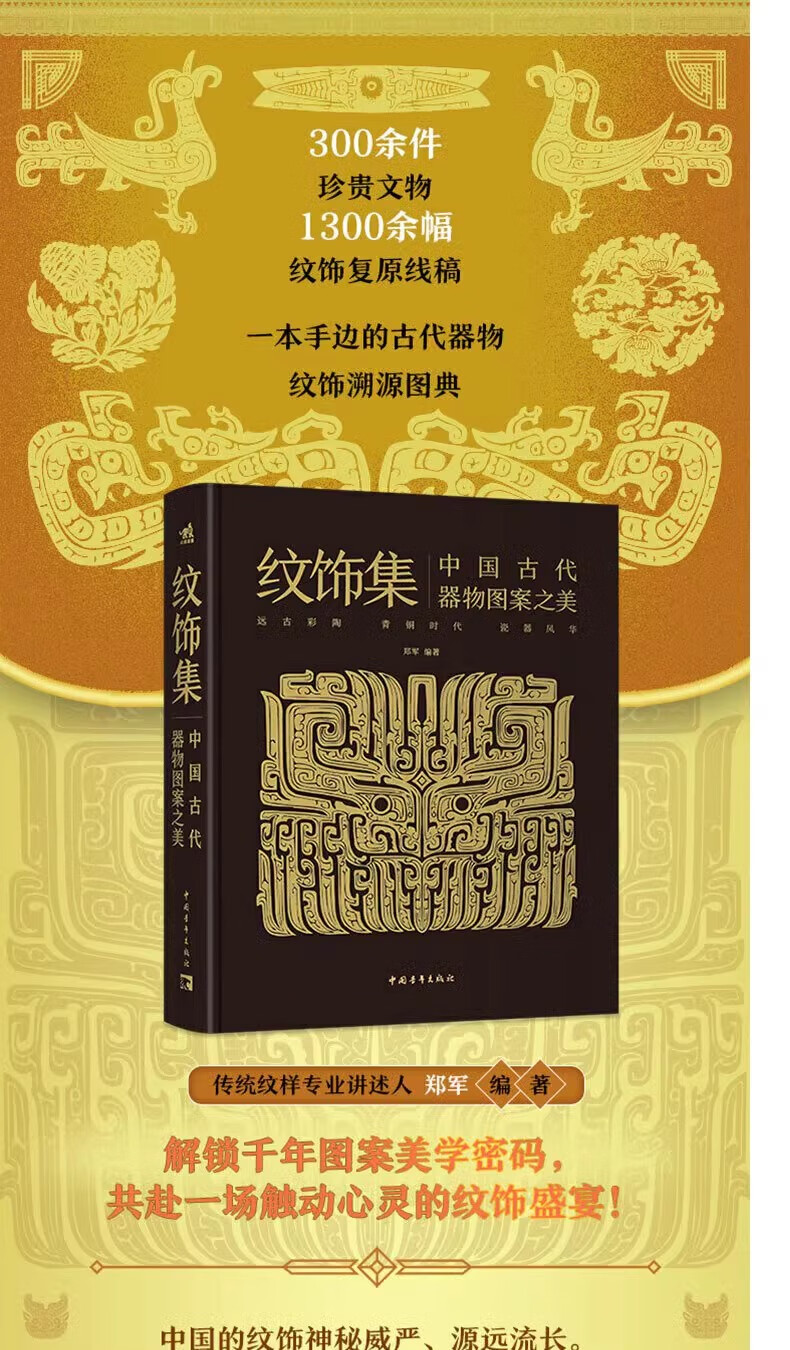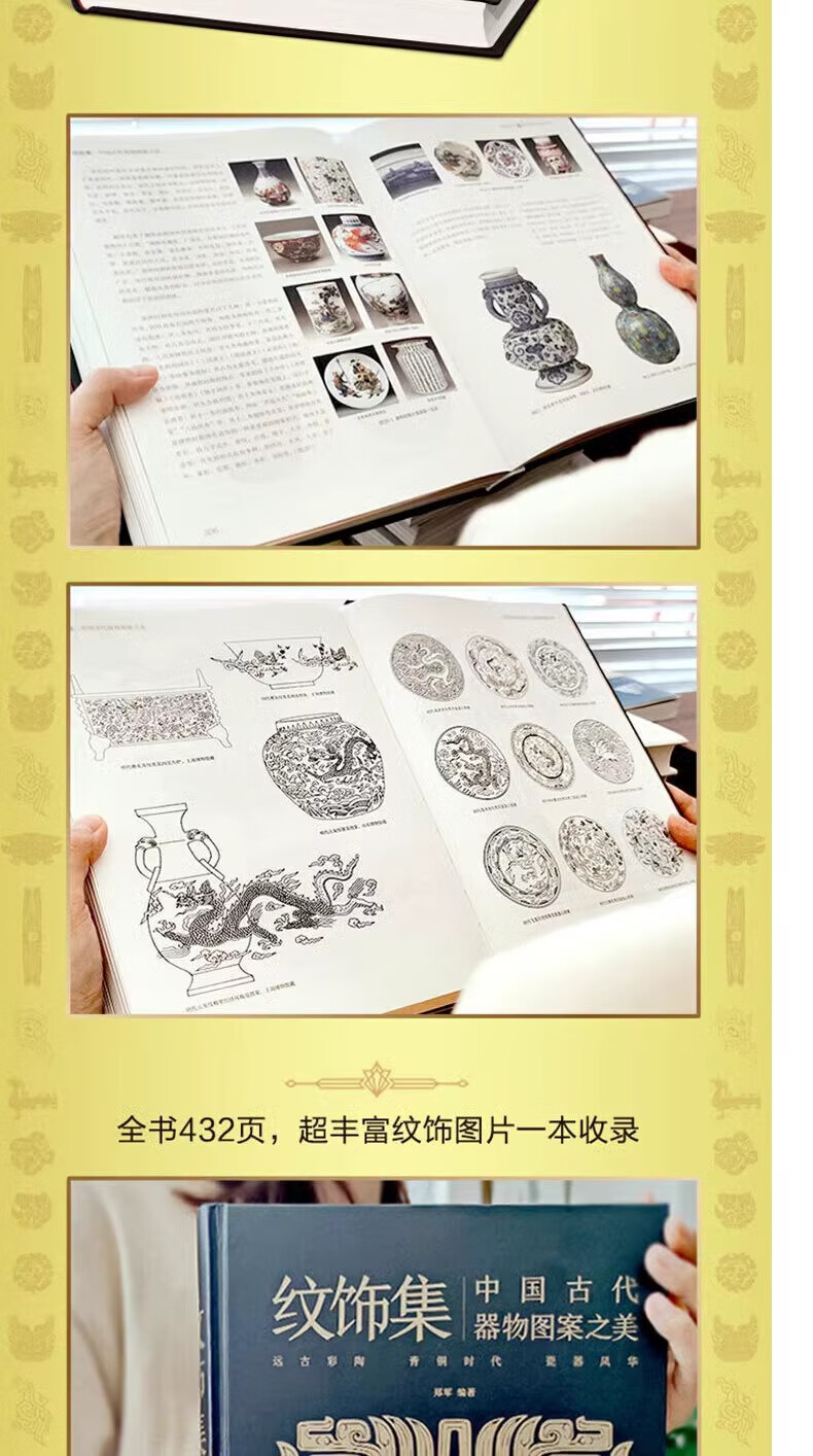Collection of Decorations - The Beauty of Patterns on Ancient Chinese Artifacts Zheng Jun More than 300 cultural relics More than 1,300 restored line drawings of decorative patterns Painted pottery Bronze Porcelain Development history and modeling characteristics Creative style and artistic characteristics Genuine