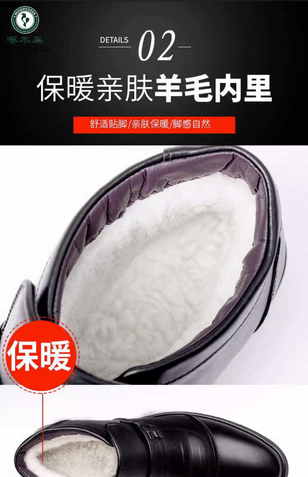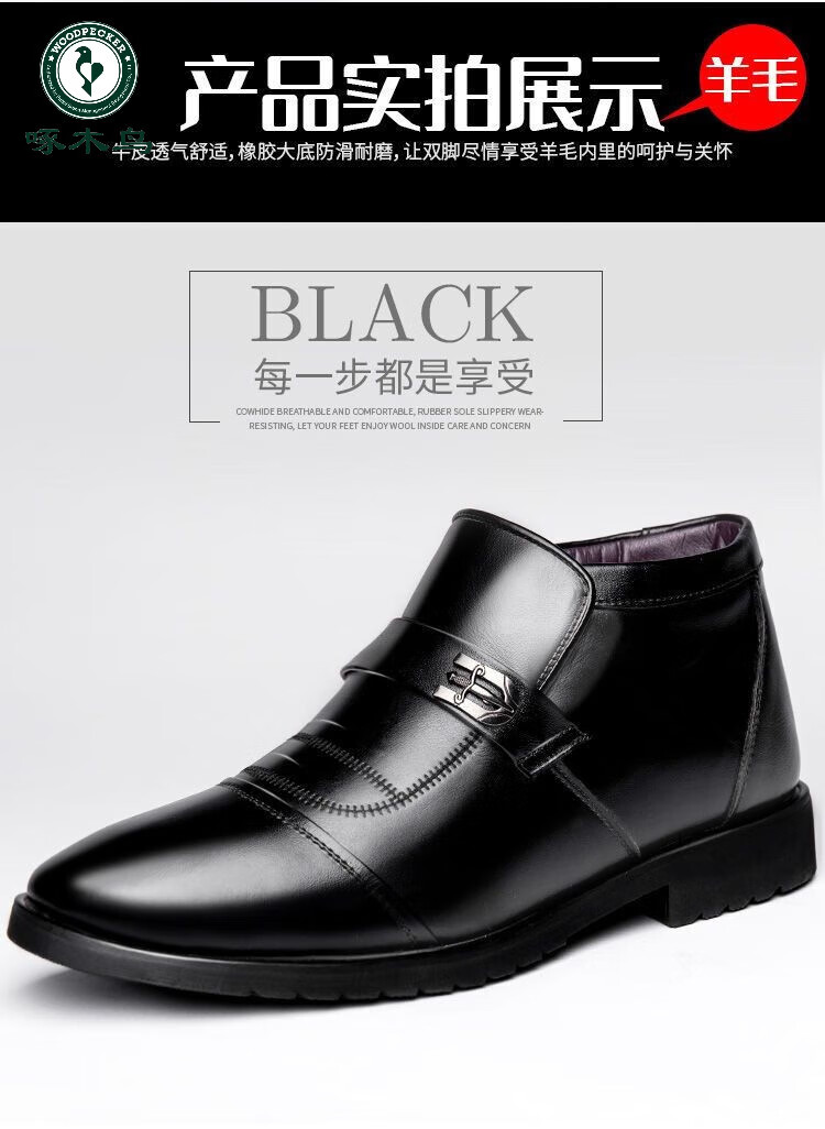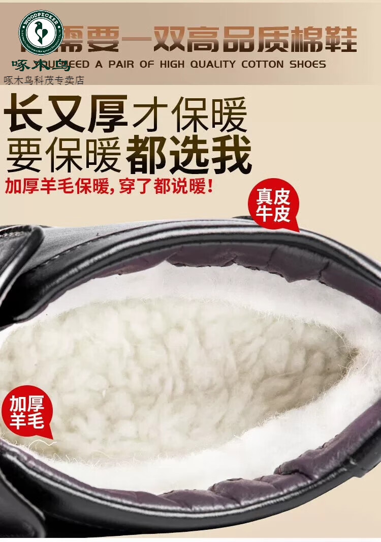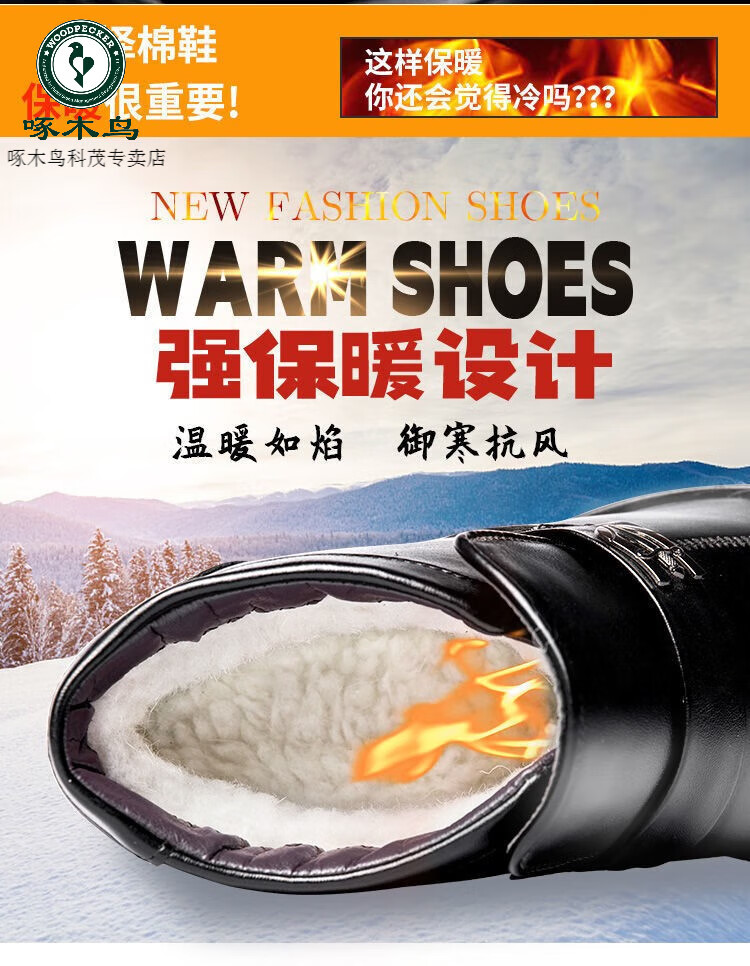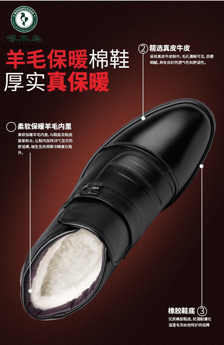Woodpecker genuine leather large cotton shoes for men in winter plus velvet to keep warm and waterproof Northeastern cotton leather shoes genuine leather middle-aged and elderly dad's shoes 9900 black 42 Woodpecker brand