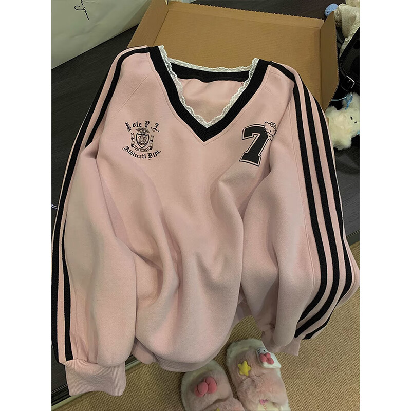 LDBE gray three-bar V-neck sweatshirt women's autumn and winter new loose American niche design lace splicing long-sleeved top Gray L