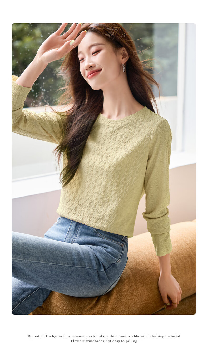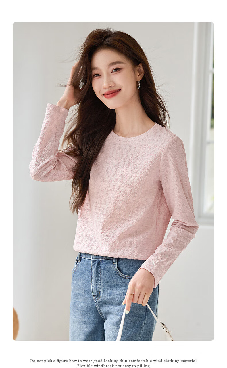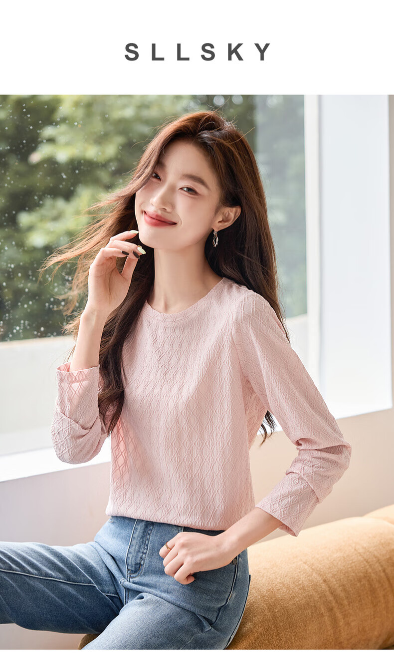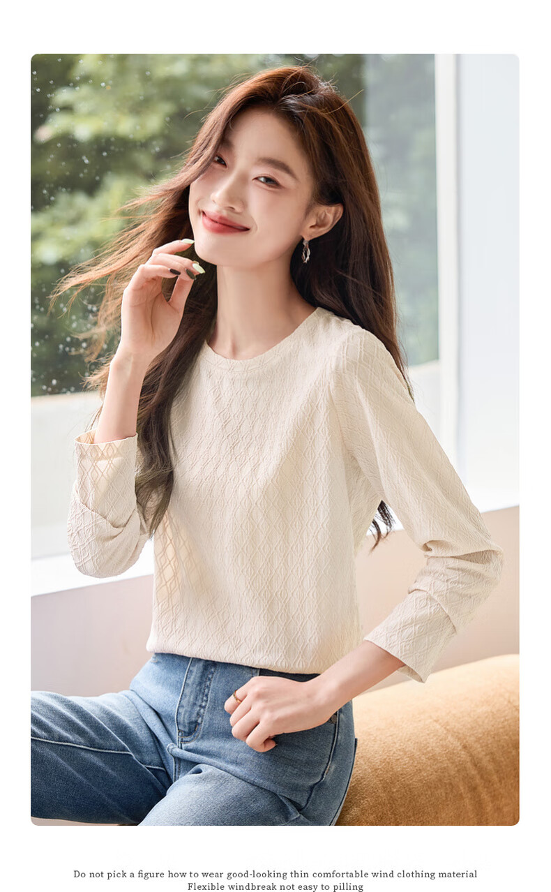 Sllsky-Camiseta con cuello redondo y diamante texturizado para mujer, camiseta de manga larga holgada informal, Top de color albaricoque lechoso 2XL 2025