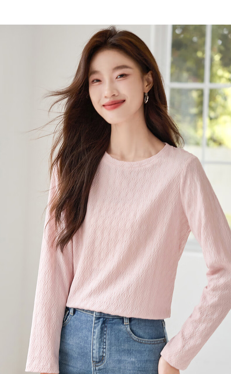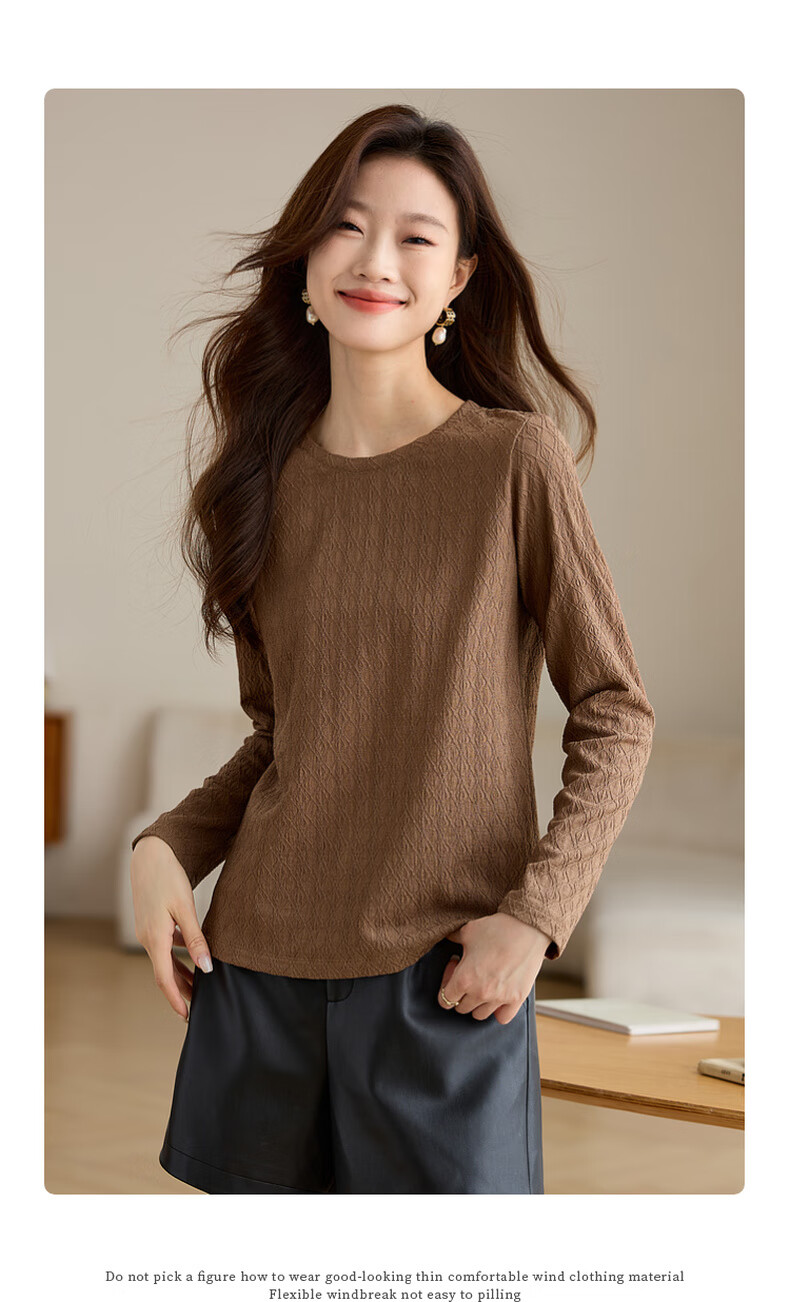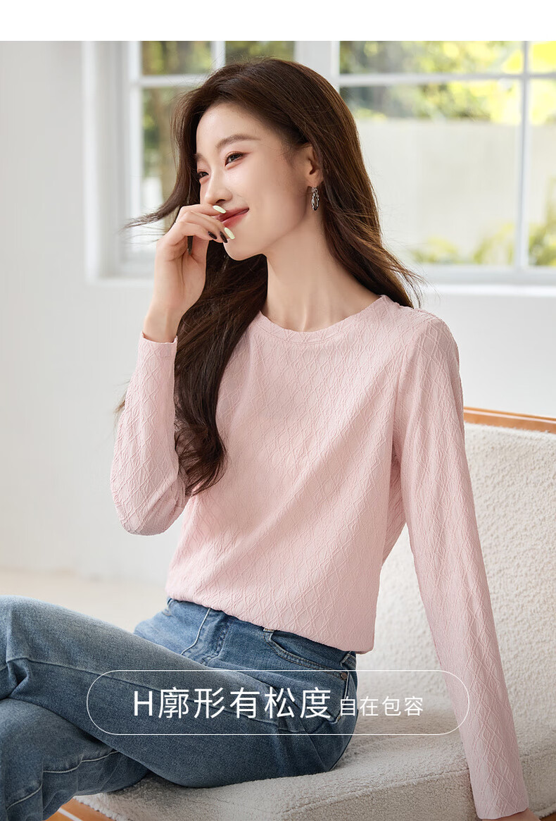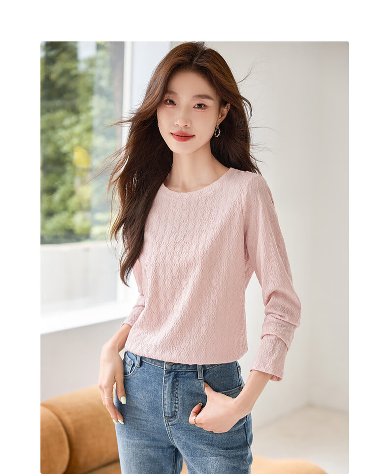 Sllsky-Camiseta con cuello redondo y diamante texturizado para mujer, camiseta de manga larga holgada informal, Top de color albaricoque lechoso 2XL 2025