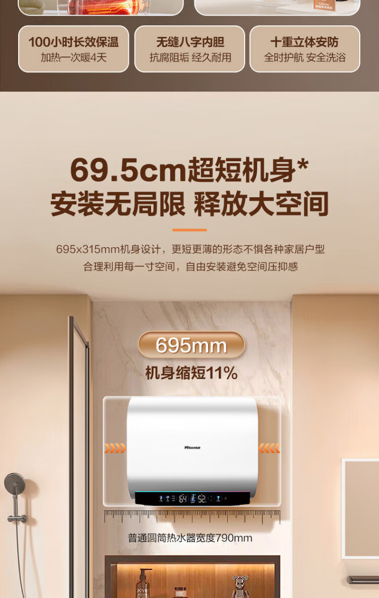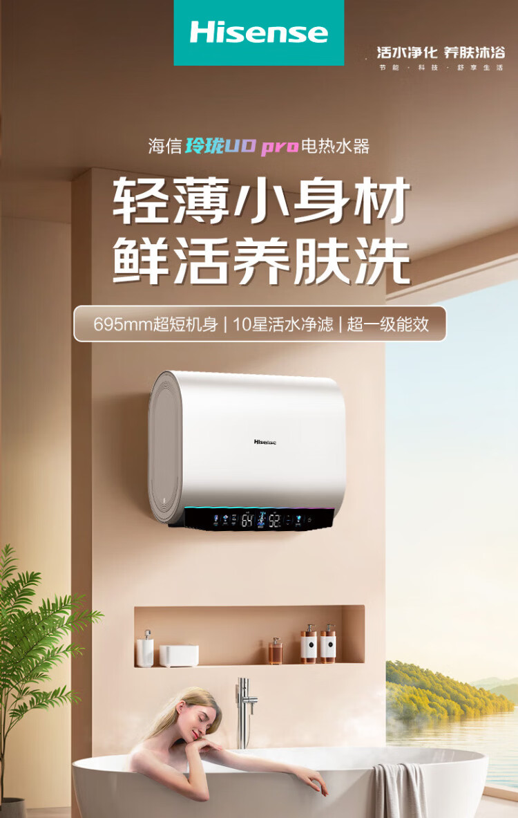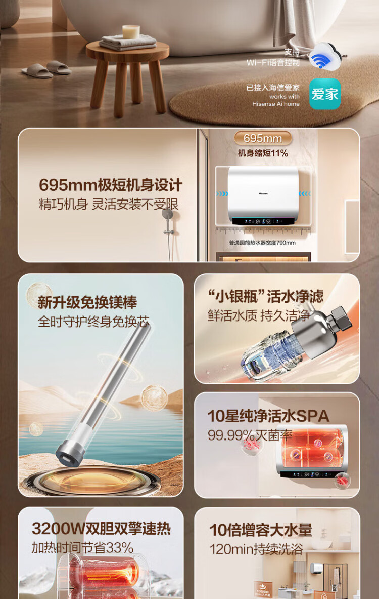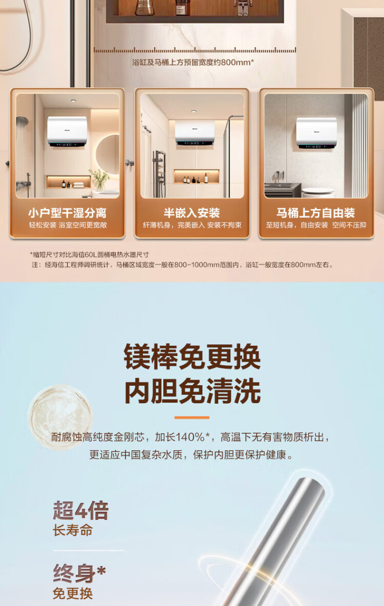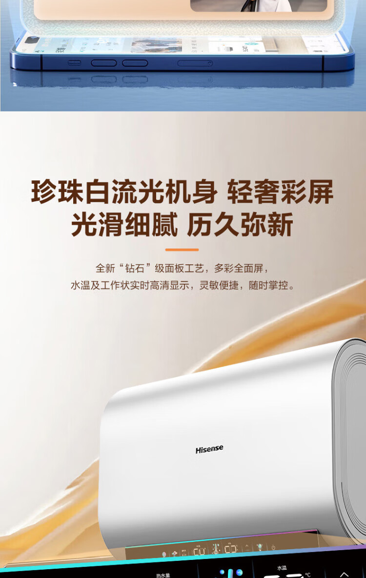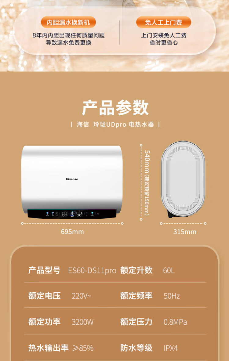 Hisense elektrischer Warmwasserbereiter, flaches Fass, kleine silberne Flasche, 60 Liter, ultradünner 695-mm-Körper, 3200 W, ersatzfreier Magnesiumstab, super erstklassige Energieeffizienz, exquisites UD ES60-DS11Pro