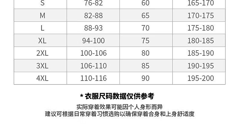 China (cm) 160-165/84-86 165-170 / 88-90 167-172 / 92-96 168-173 / 98-102 170-176 / 106-110