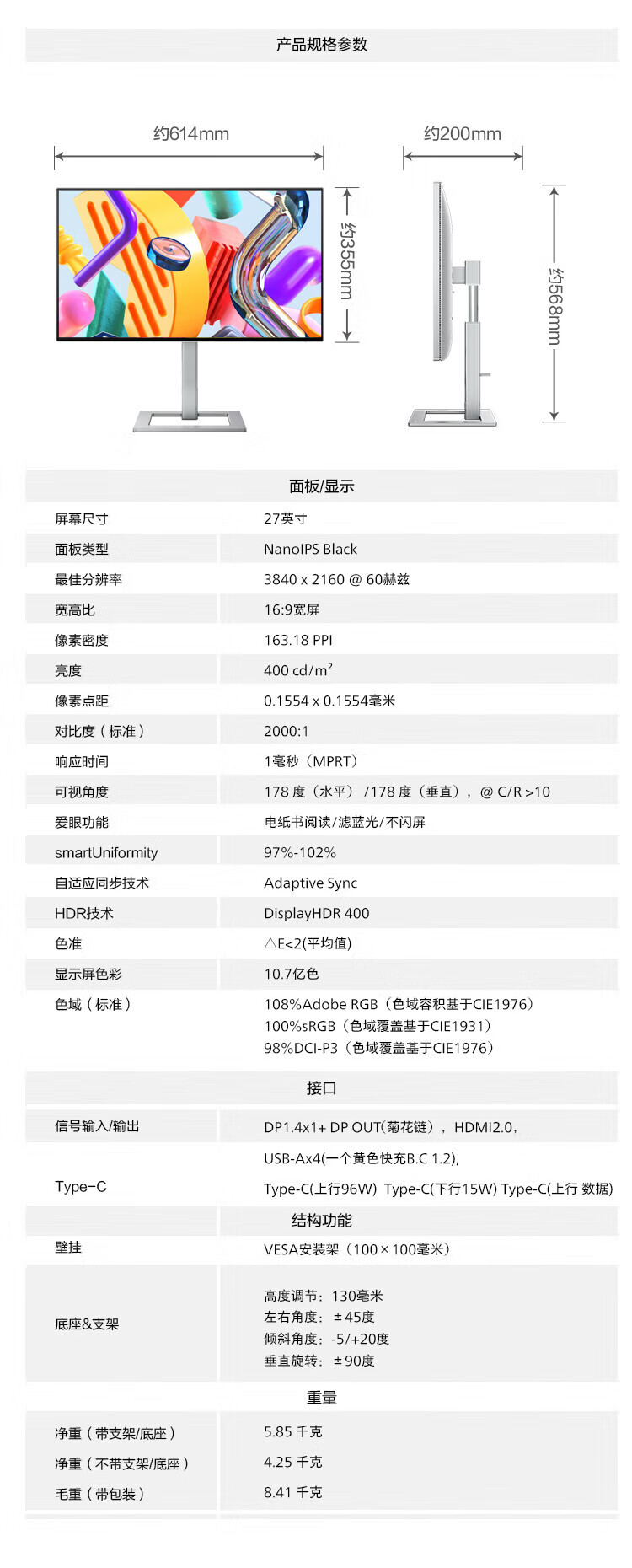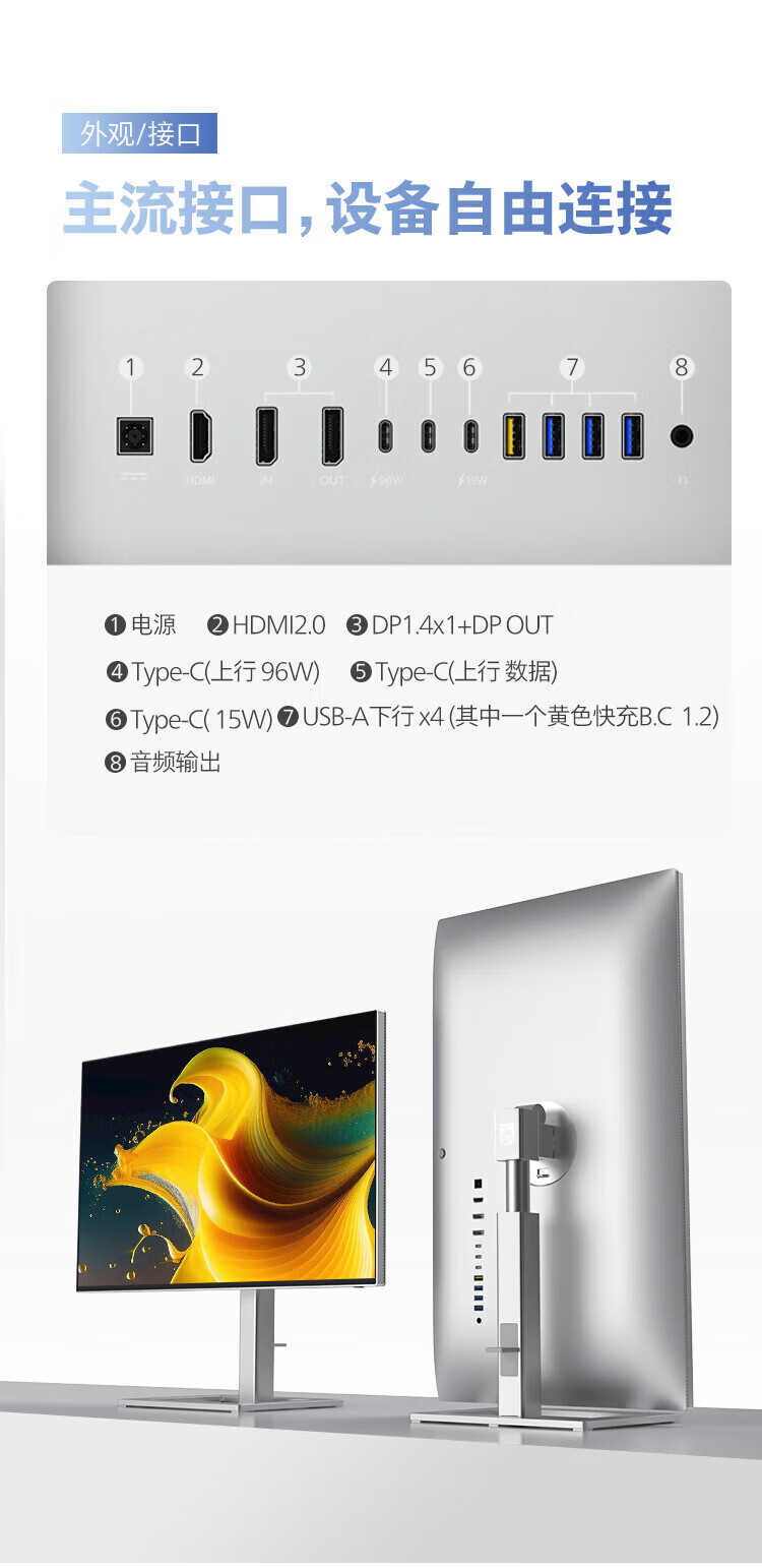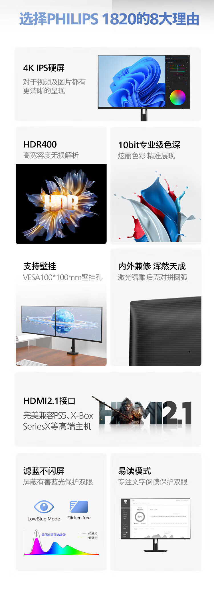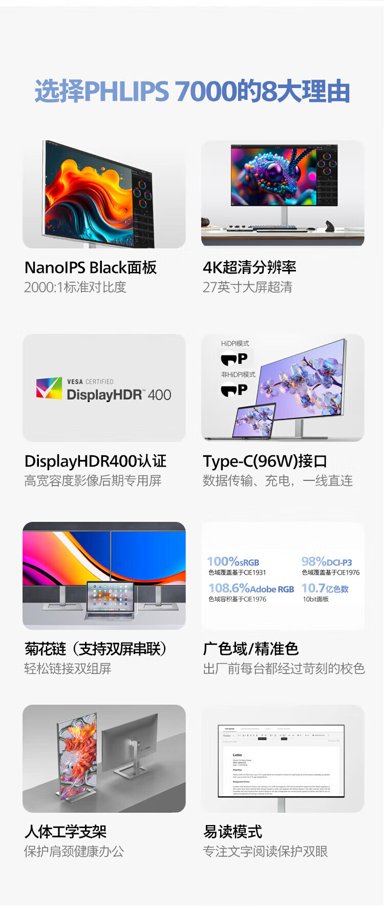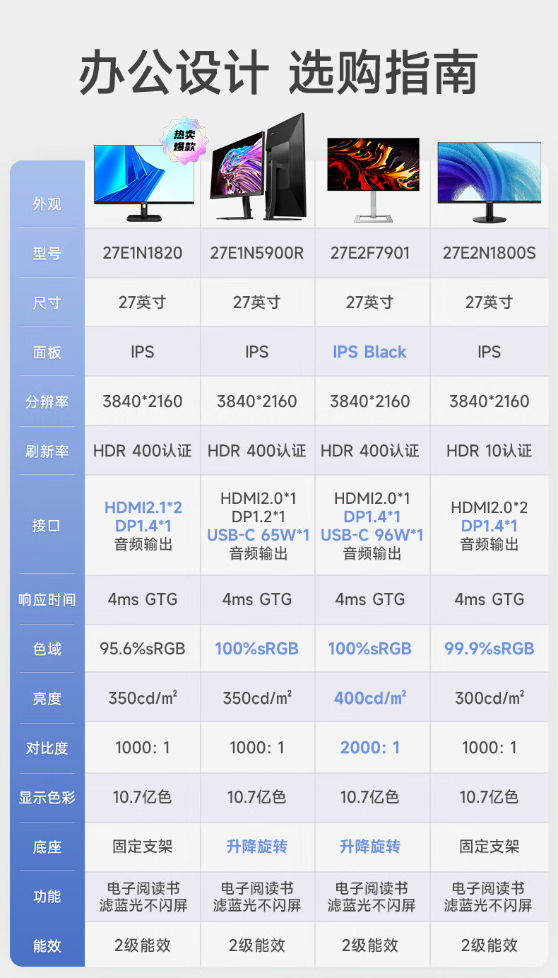 Philips (PHILIPS) 27-inch 4K display IPS 10bit HDR400 low blue light non-flicker screen HDMI2.1+DP1.4 built-in power supply office design display 27E1N1820 27E1N5900R worry-free service 4K/TypeC65W 3 years worry-free