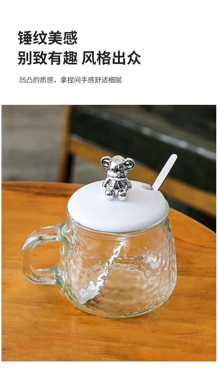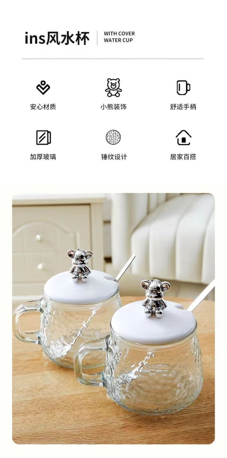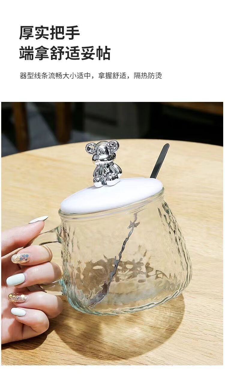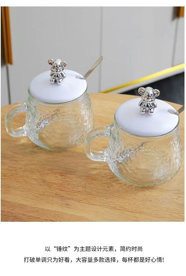 Glass cup with lid bear cup high-value cup office home coffee cup internet celebrity hot water cup 1 small bear cup (with spoon) 270ml