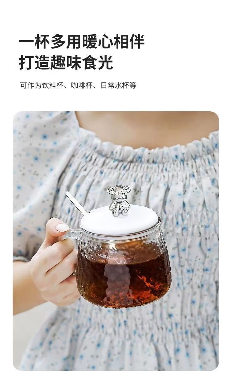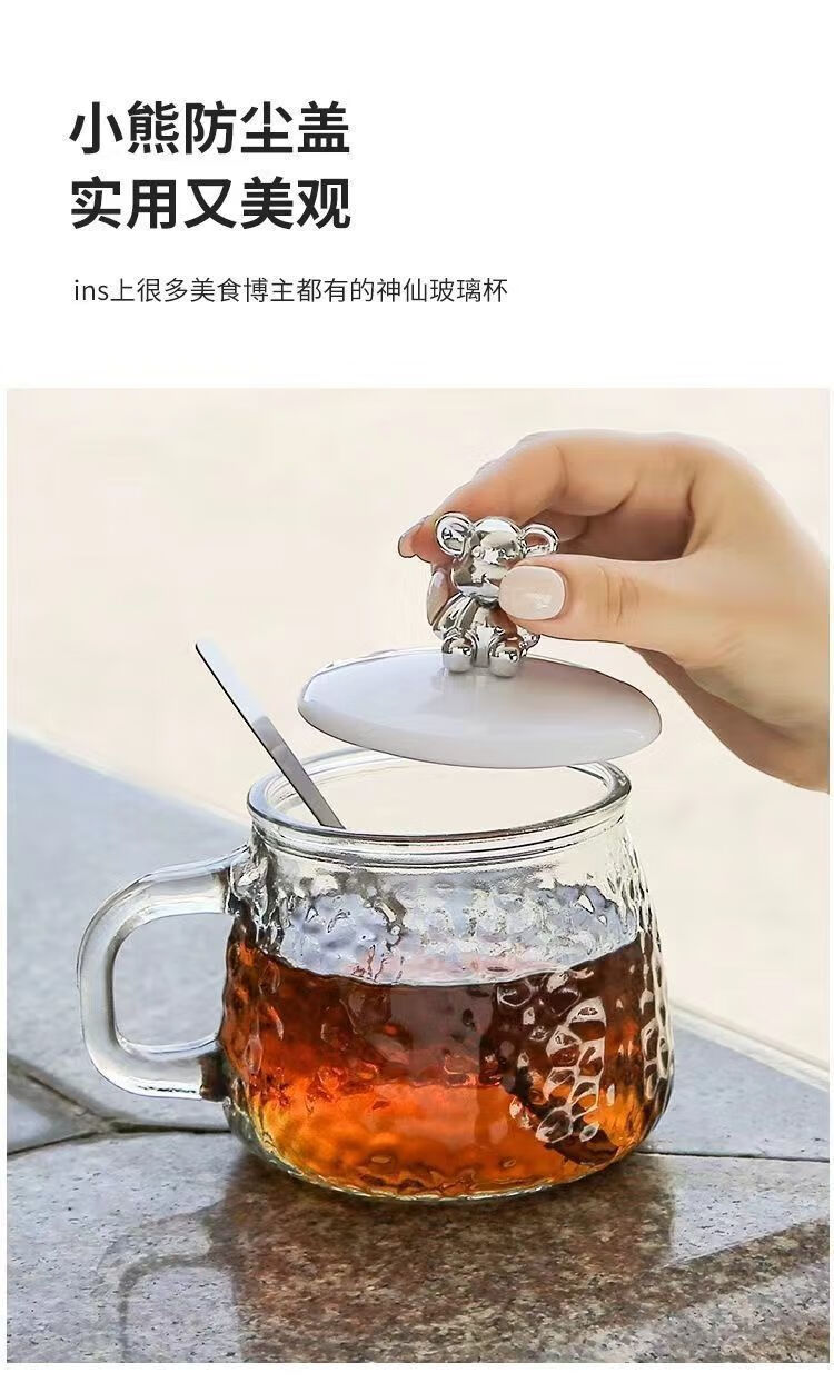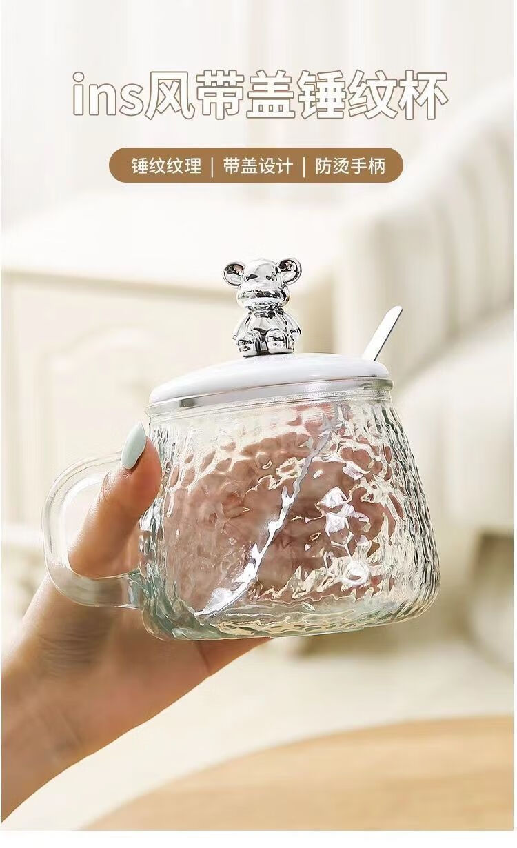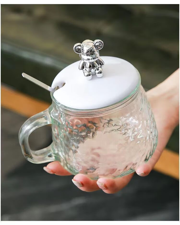 Glass cup with lid bear cup high-value cup office home coffee cup internet celebrity hot water cup 1 small bear cup (with spoon) 270ml