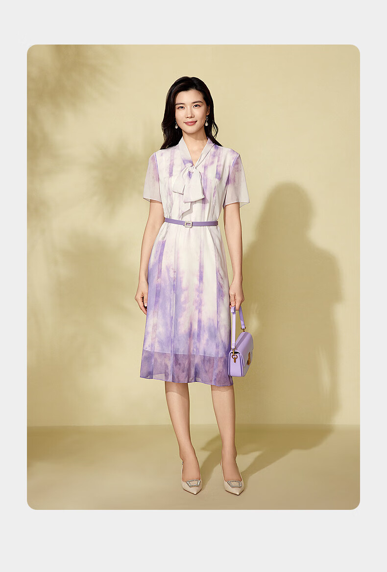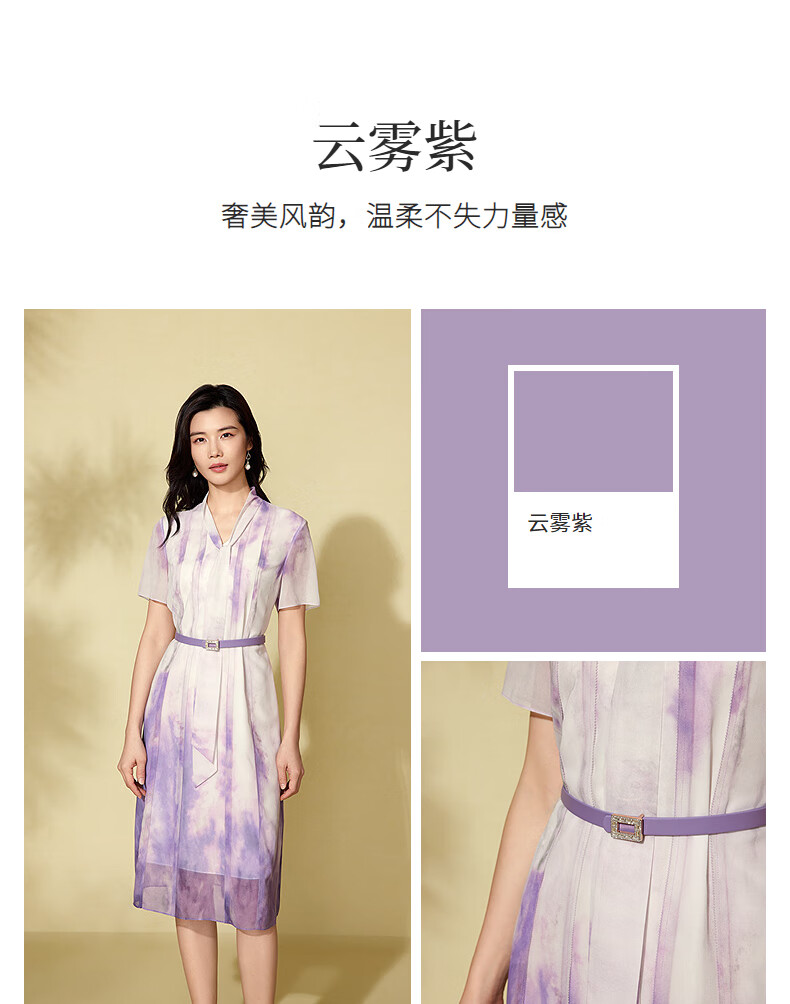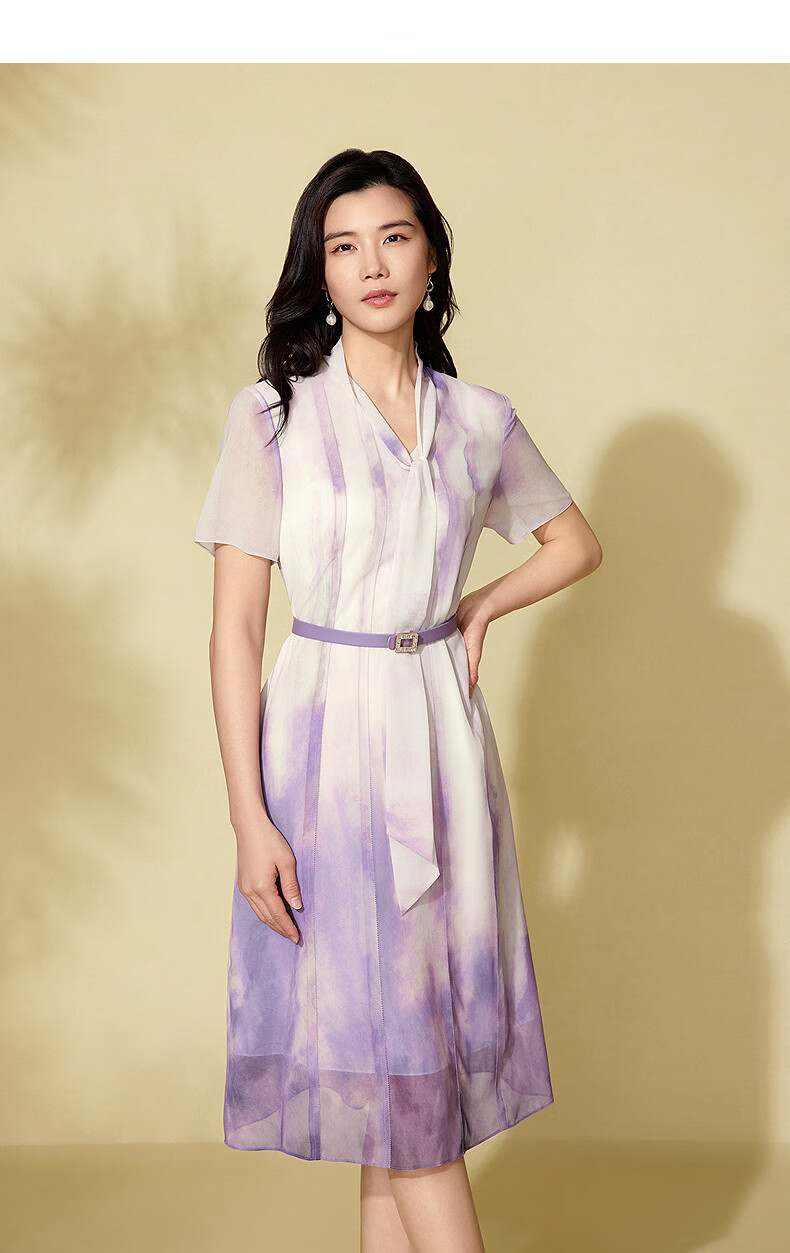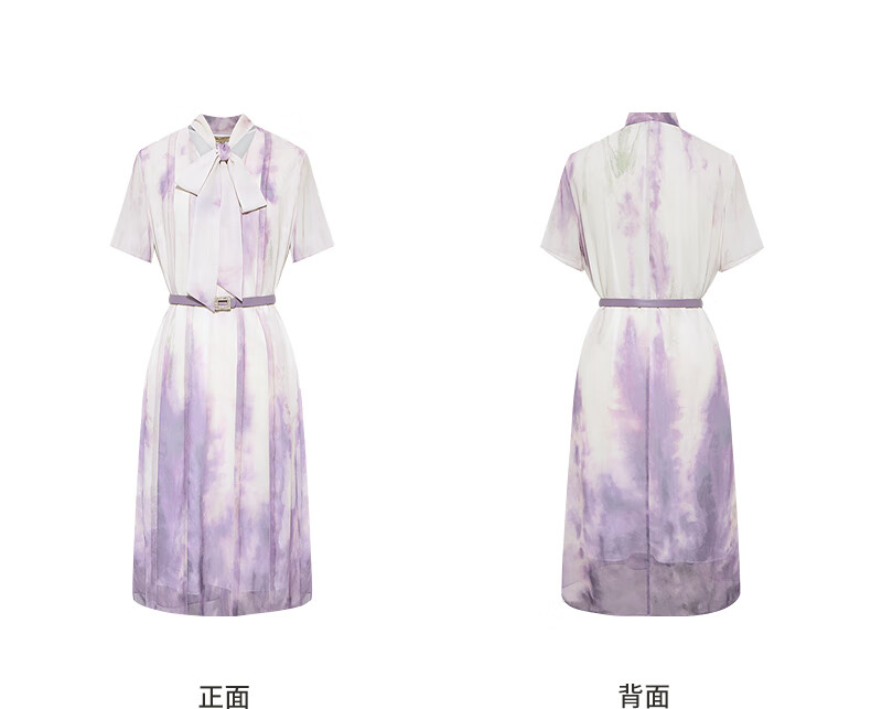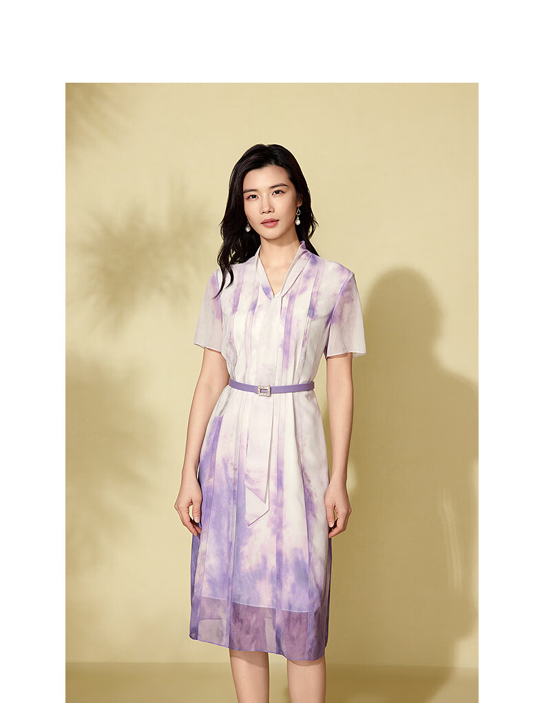 粉蓝衣橱【紫霞绮梦】2025夏装东方感飘带印花短袖连衣裙女552L689 云雾紫 S