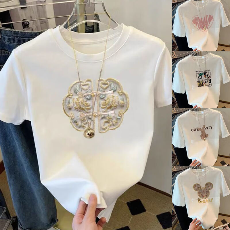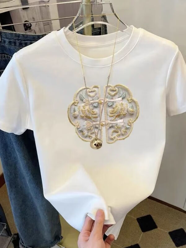 Mu Yilin T-shirt Women's Summer New Elegant Chinese Style T-shirt Round Neck White Printed Threaded Short Sleeve Versatile White Casual New Chinese Style 1473 L