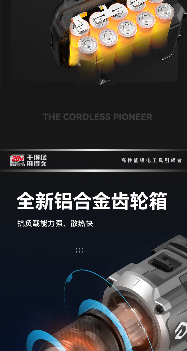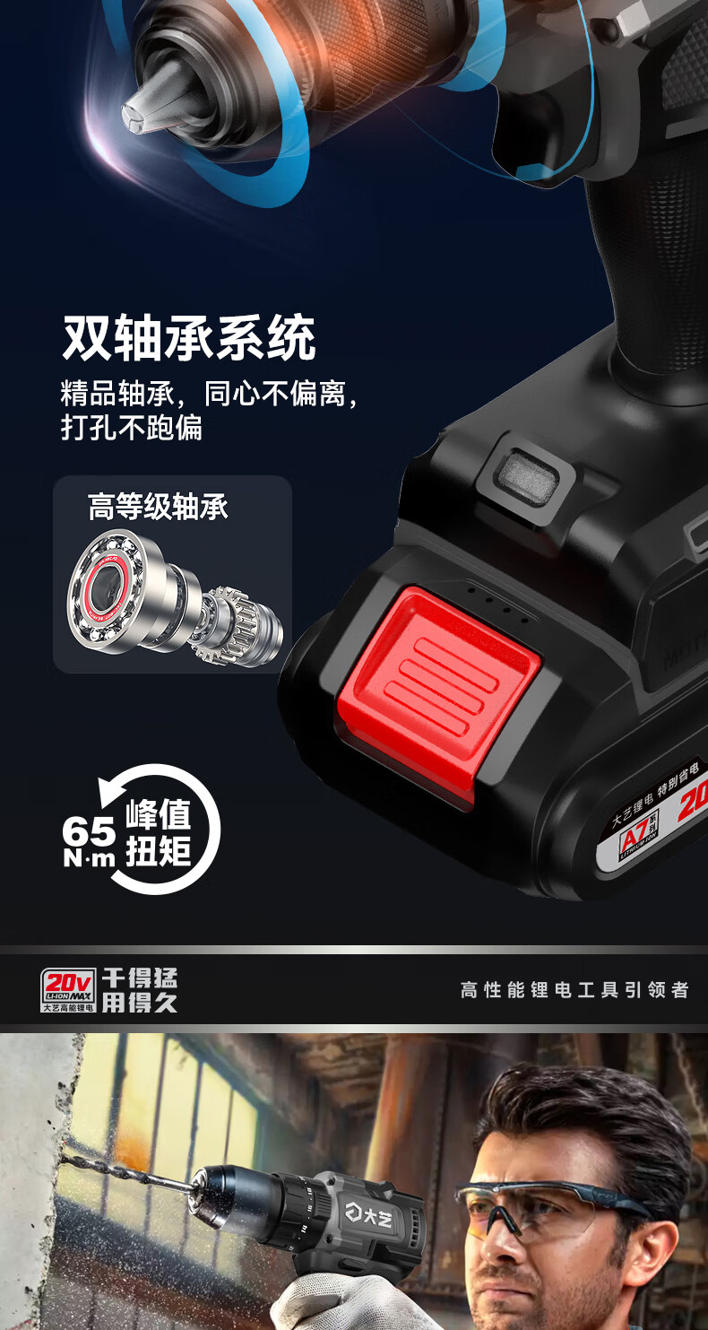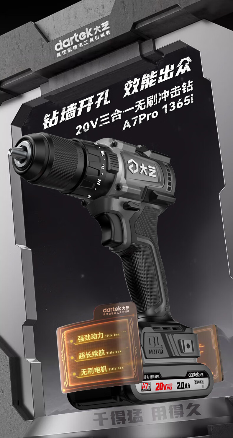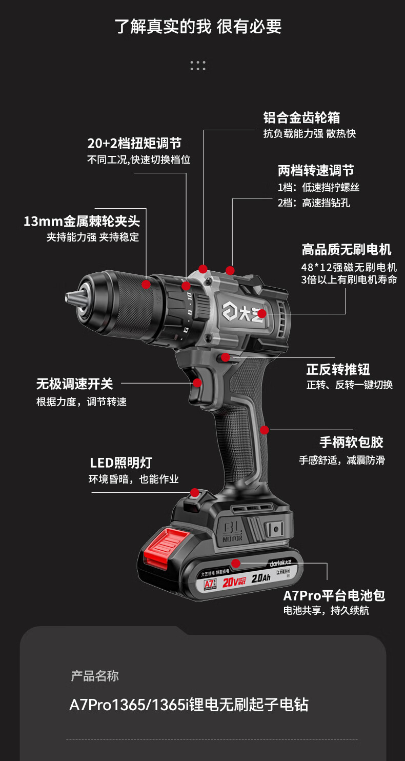 Dayi's new A7Pro1365 industrial grade 20V lithium battery brushless impact drill electric screwdriver rechargeable hand drill A7Pro1365i-2.0 single battery package