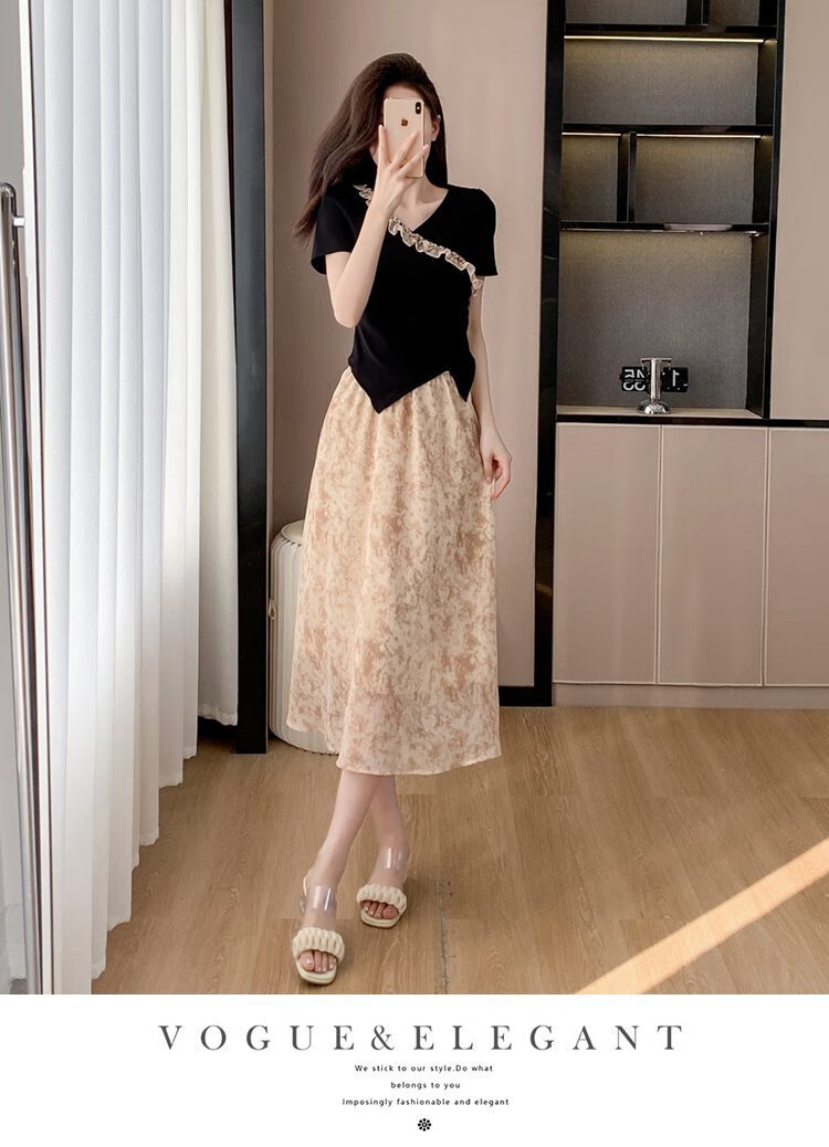 Pierre Cardin (Pierre Cardin) neuer Spleißanzug im chinesischen Stil mit V-Ausschnitt, kontrastierendes Spitzenoberteil, schmal geschnittenes T-Shirt, bauchbedeckender, unregelmäßiger Rockanzug für Damen 838 S empfohlen 85-95Jin Jin entspricht 0,5 kg