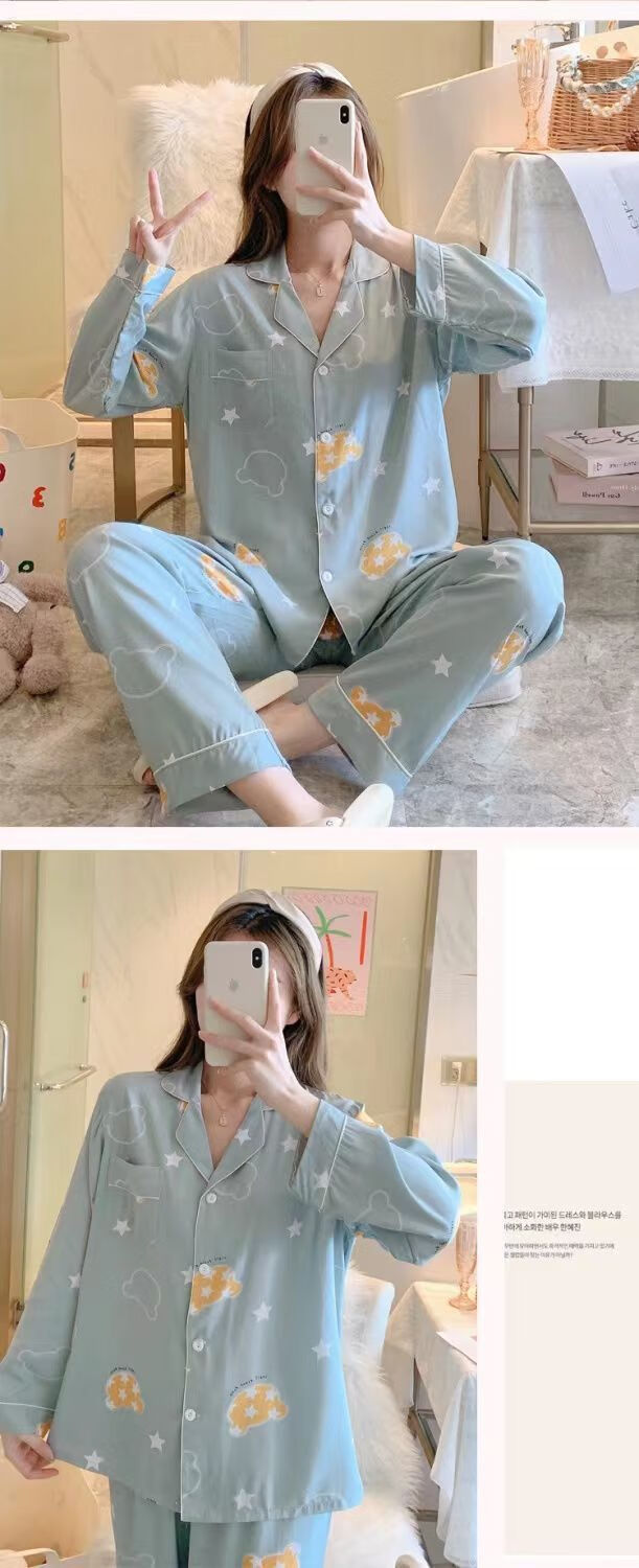 LangSha skin-friendly cotton pajamas for women spring and summer lapel cardigan long-sleeved loose large size can go out thin breathable home wear set 854 M 80-100Jin Jin is equal to 0.5 kg