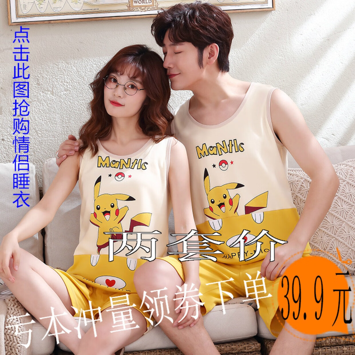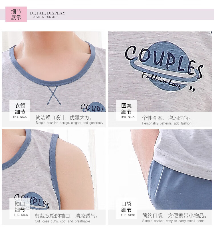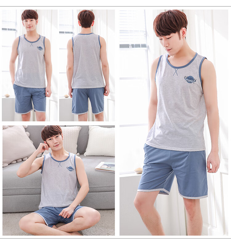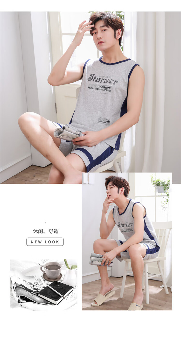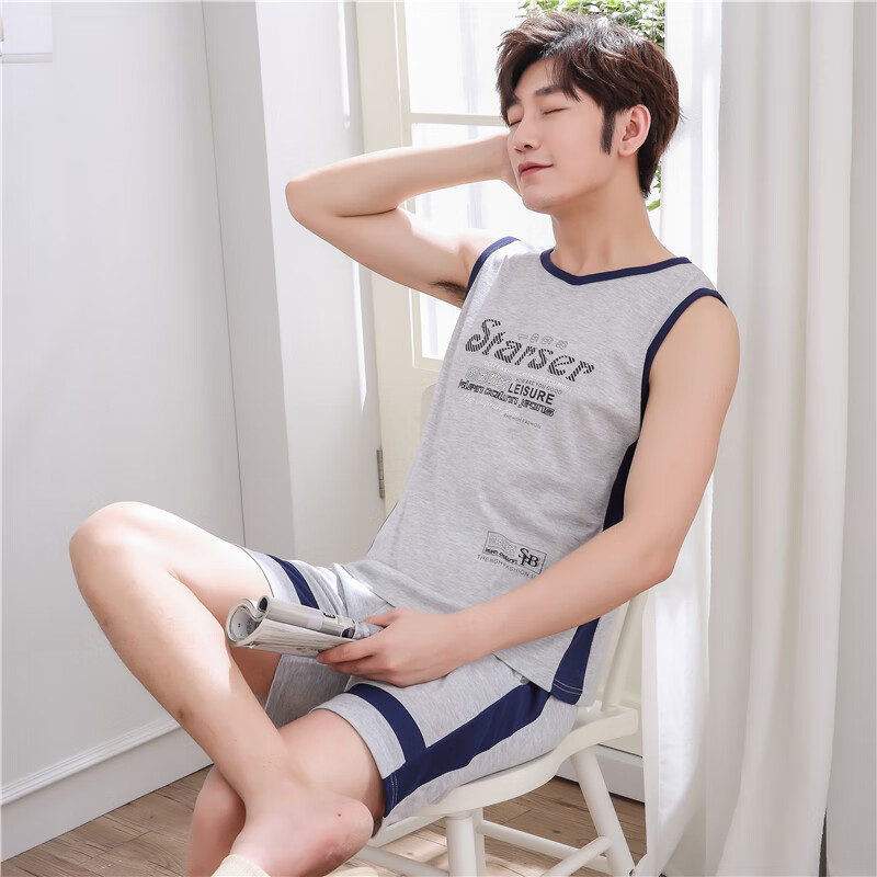 浪莎男士背心夏季青少年无袖短裤睡衣大码薄款纯棉套装男款外穿家居服 1283牛仔豚男牙 L码100-125斤 均码