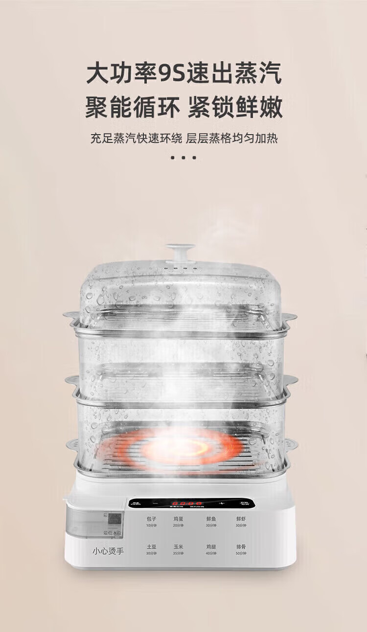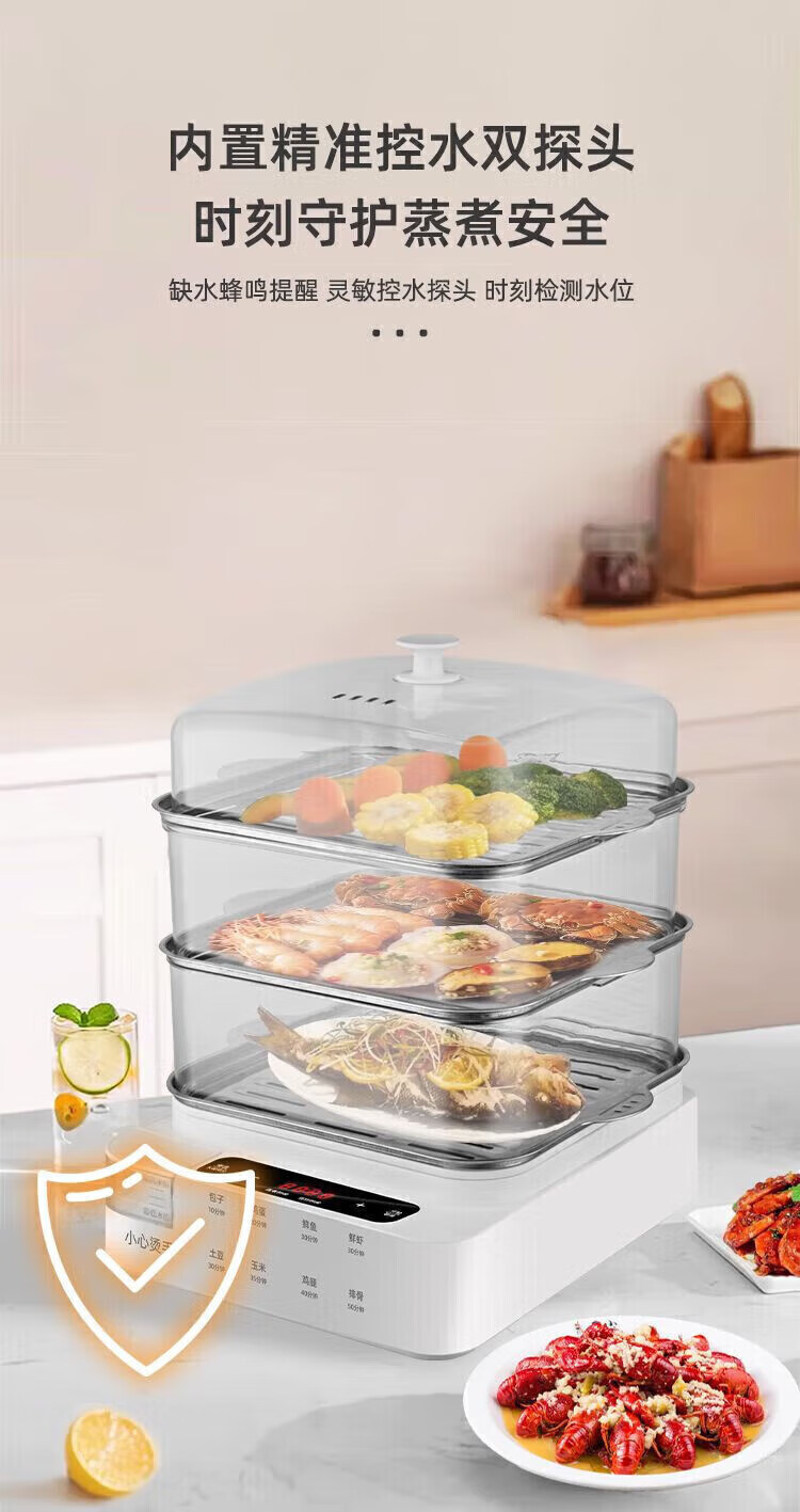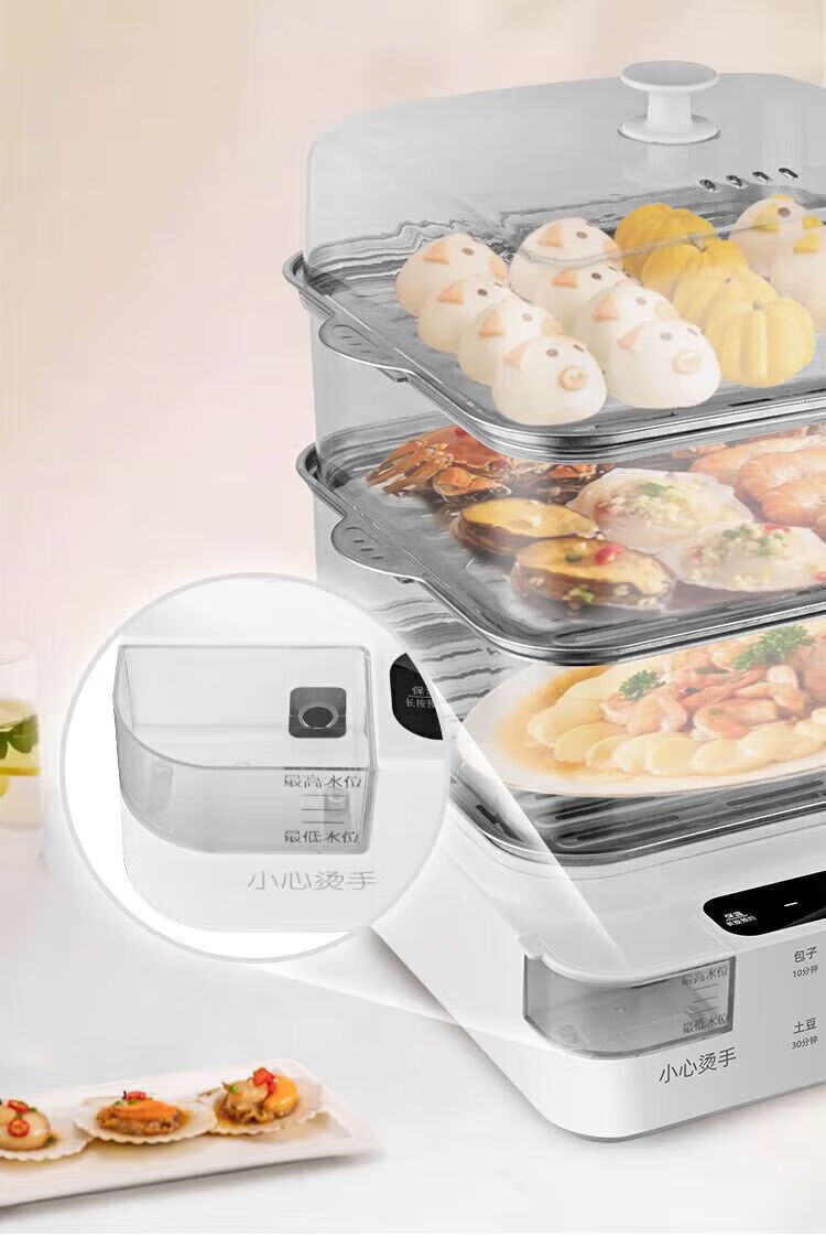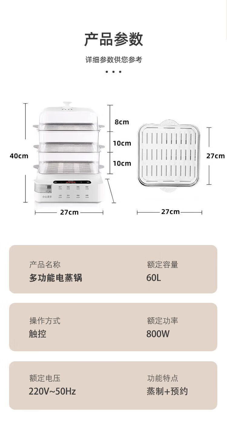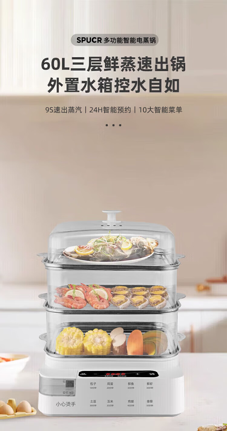 SPUCR Subo electric steamer three-layer 60L large-capacity household electric steamer multi-layer steam pot multi-purpose steamer multi-function electric steamer fully transparent window stainless steel steaming sheet [42L three-layer] + 4 stew cups high-end stainless steel model