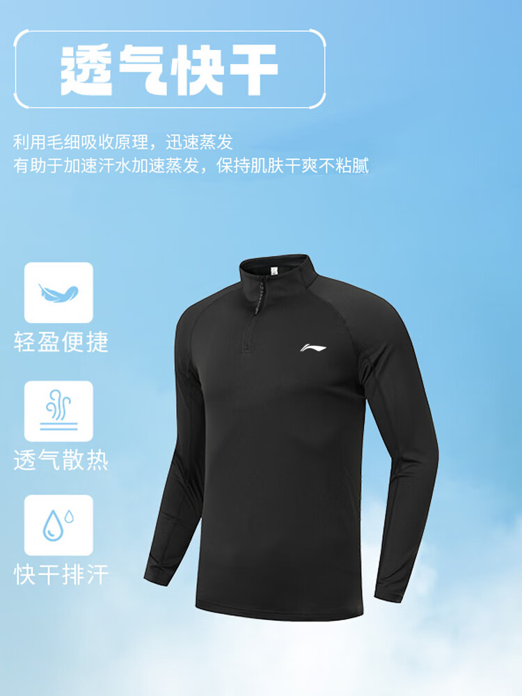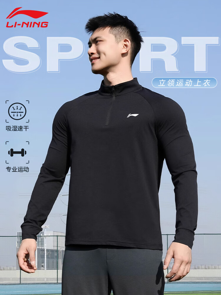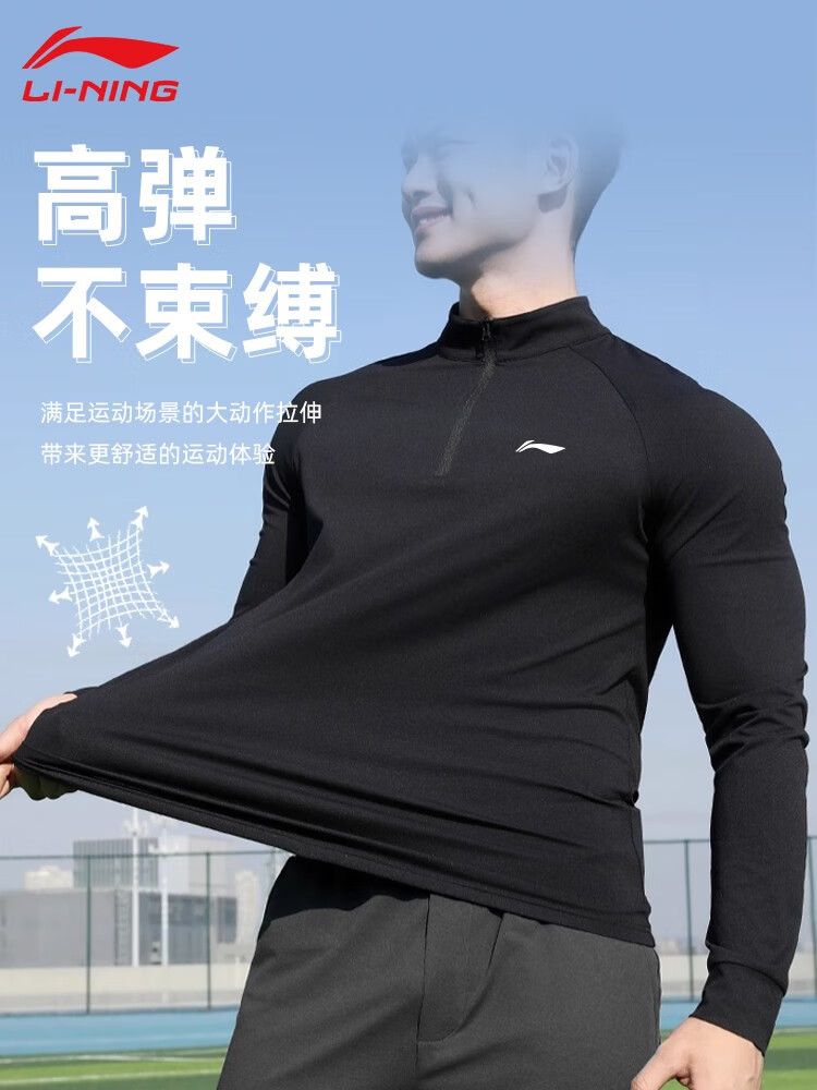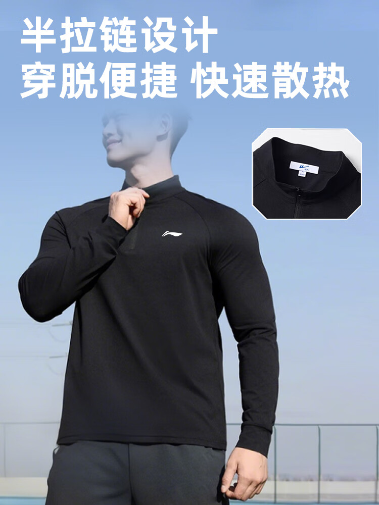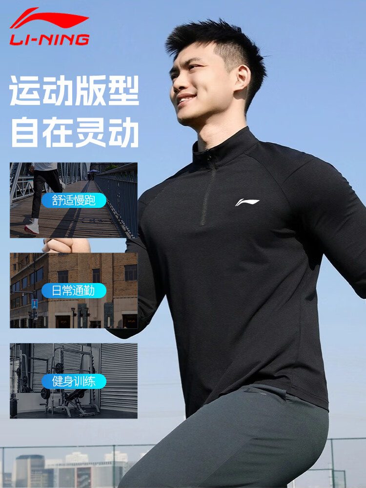 Li Ning Zipper Sunscreen Long Sleeve T-Shirt Men's Autumn New Business Commuting Fitness Sweater Casual Bottoming Top Black Fitness T-Shirt L