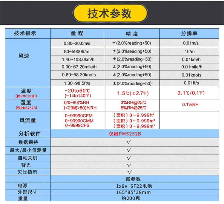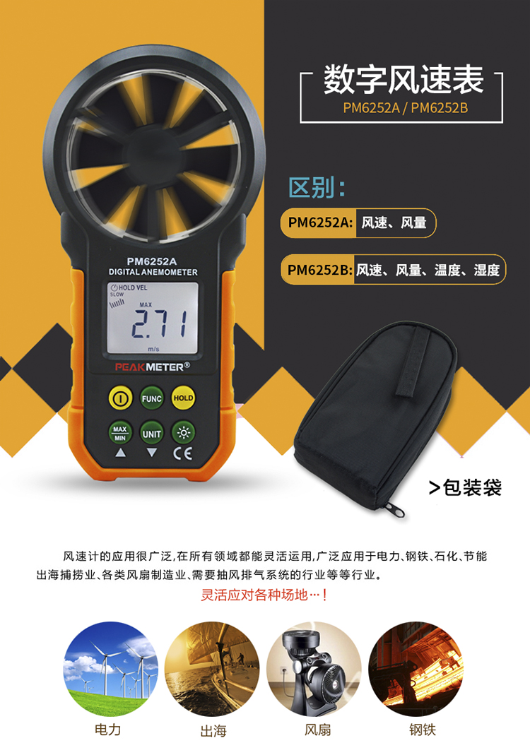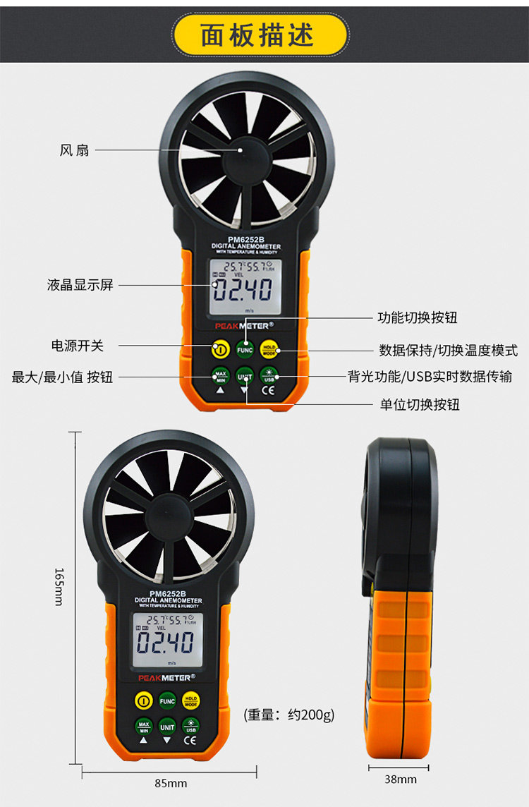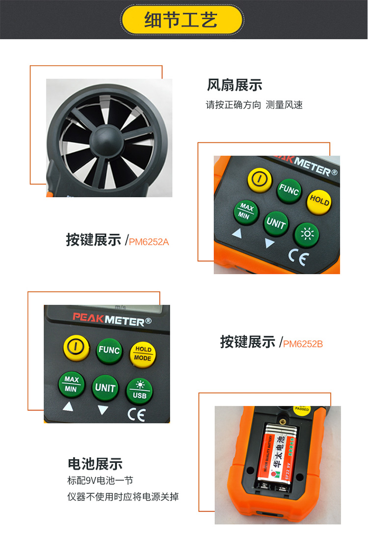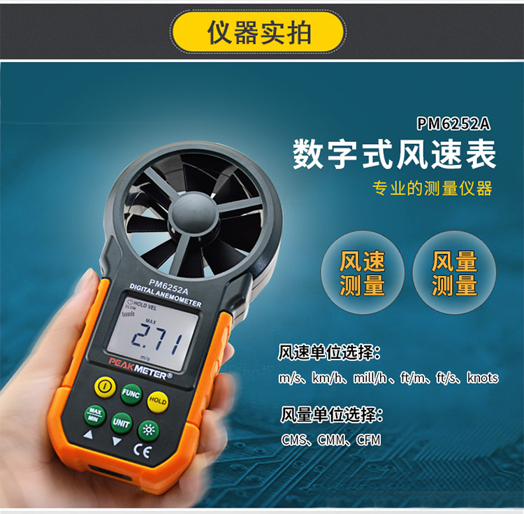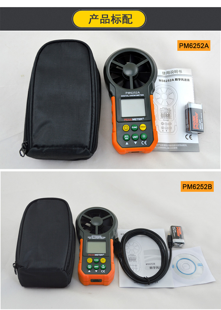 PEAKMETER anemometer PM6252A/PM6252B air volume counting display wind speed and temperature measuring instrument temperature and humidity tester PM6252A standard configuration (wind speed + air volume)
