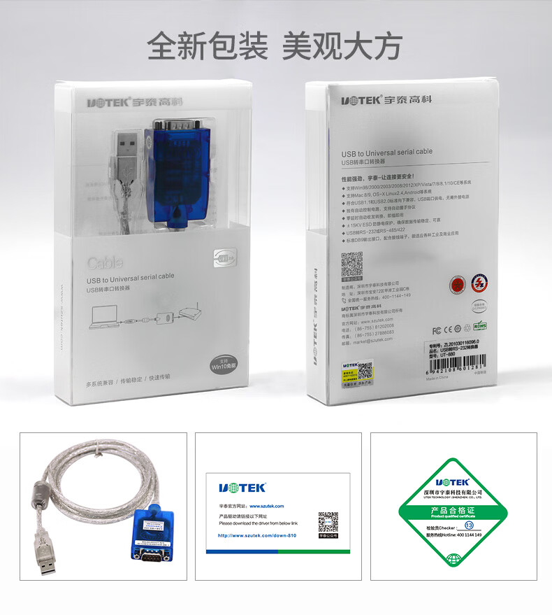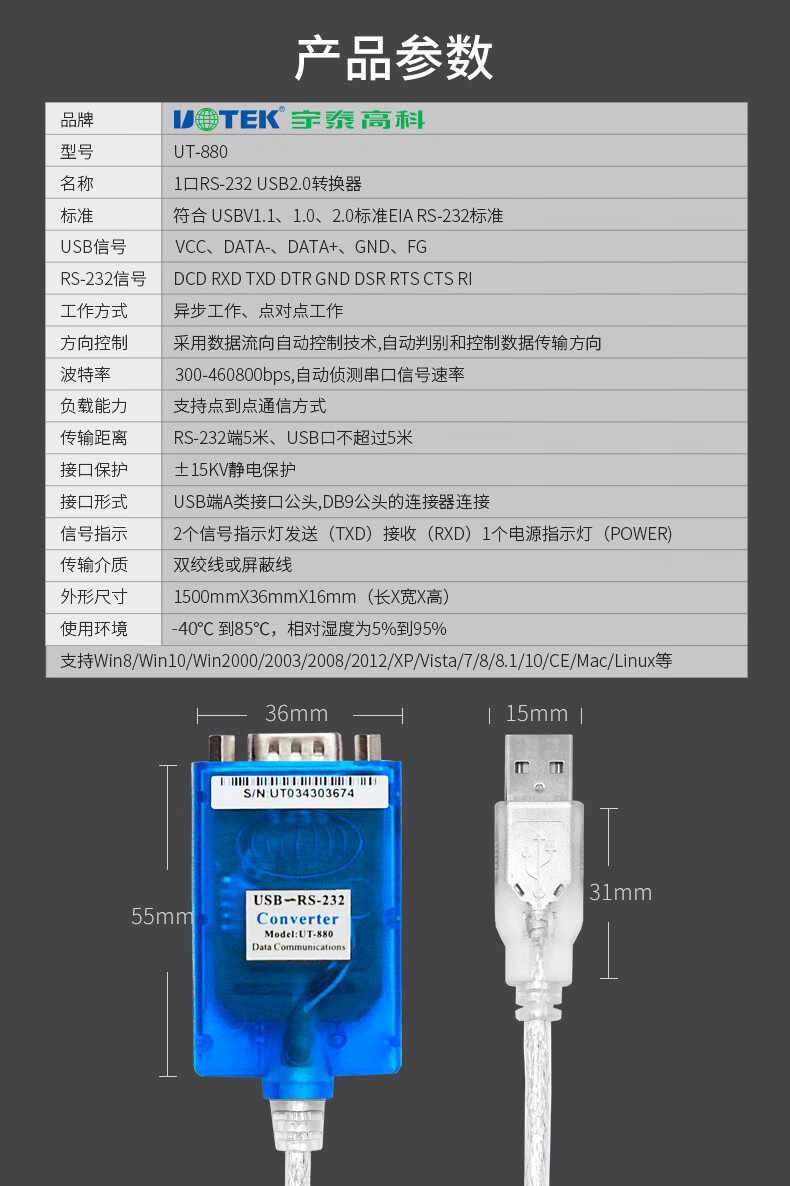 宇泰高科(utek) 工业级USB转RS232串口线 9针com口转接头 / 转接线UT-880 1.5M(UT-880)