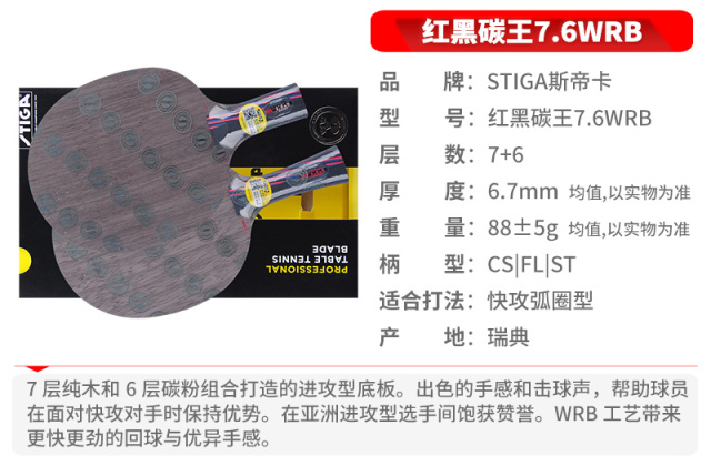 STIGA STIGA Red and Black Carbon King 7.6 WRB Table Tennis Base Plate Horizontal Shot Offensive Type