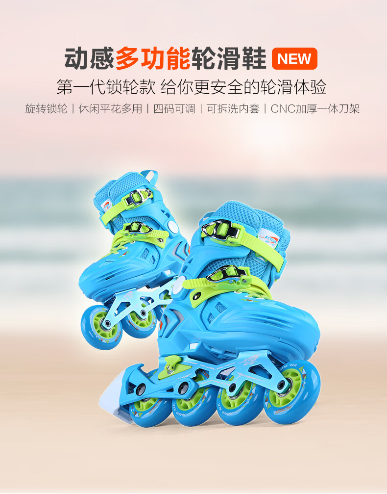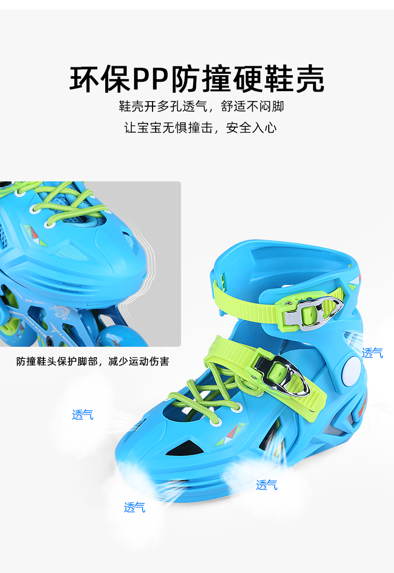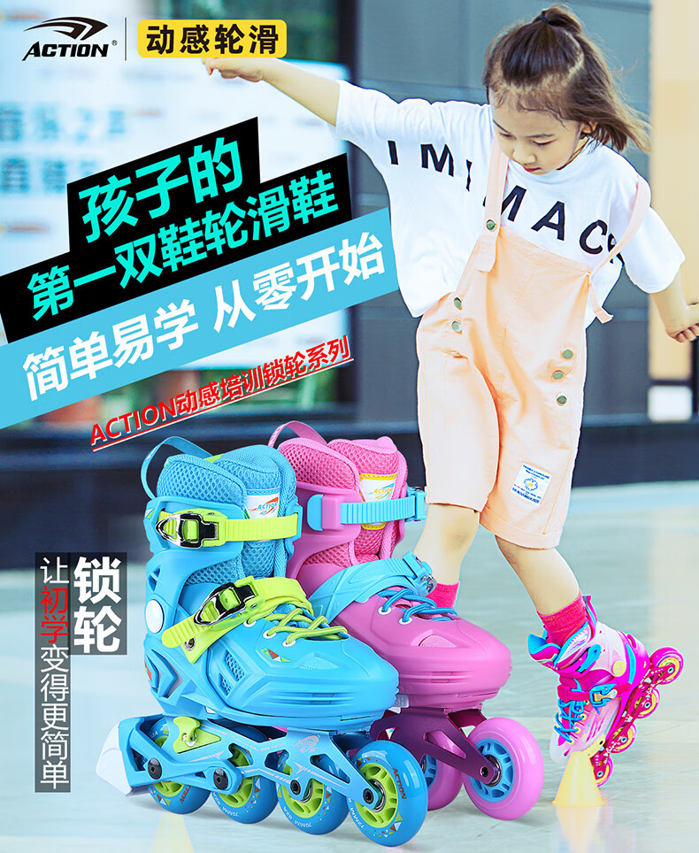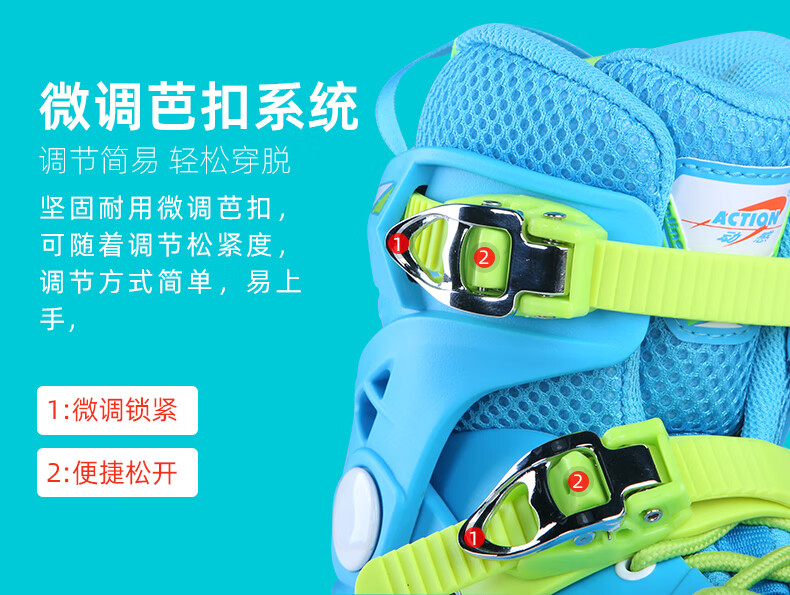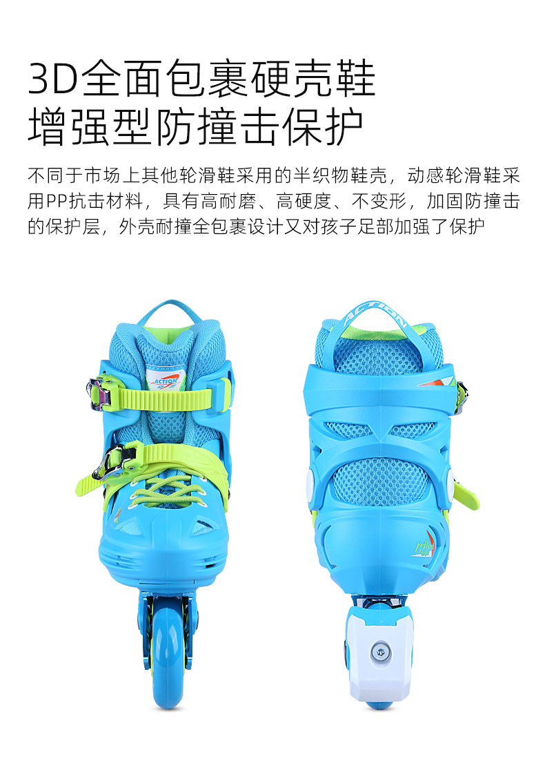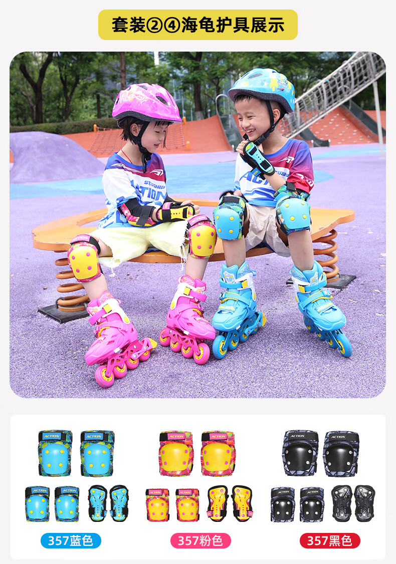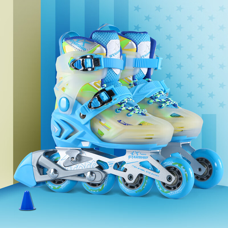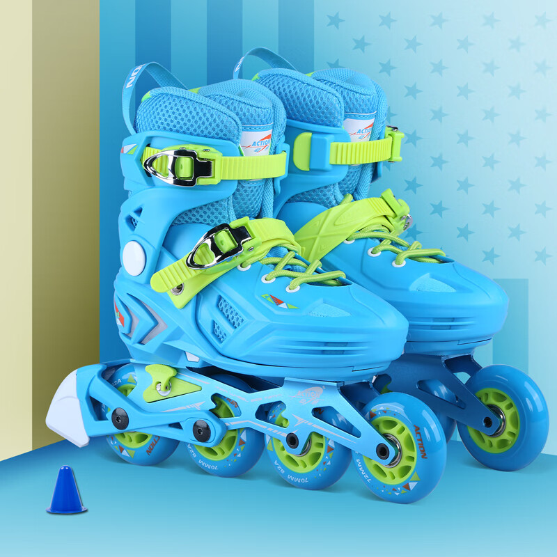 Dynamic (ACTION) skates for children, beginners' fancy shoes, adjustable size roller skates for boys and girls, locking wheel flat roller skates, full set of roller skates, light and shadow blue, set of 2 shoes + 912 helmet + turtle protective gear + bag L 36-39 size