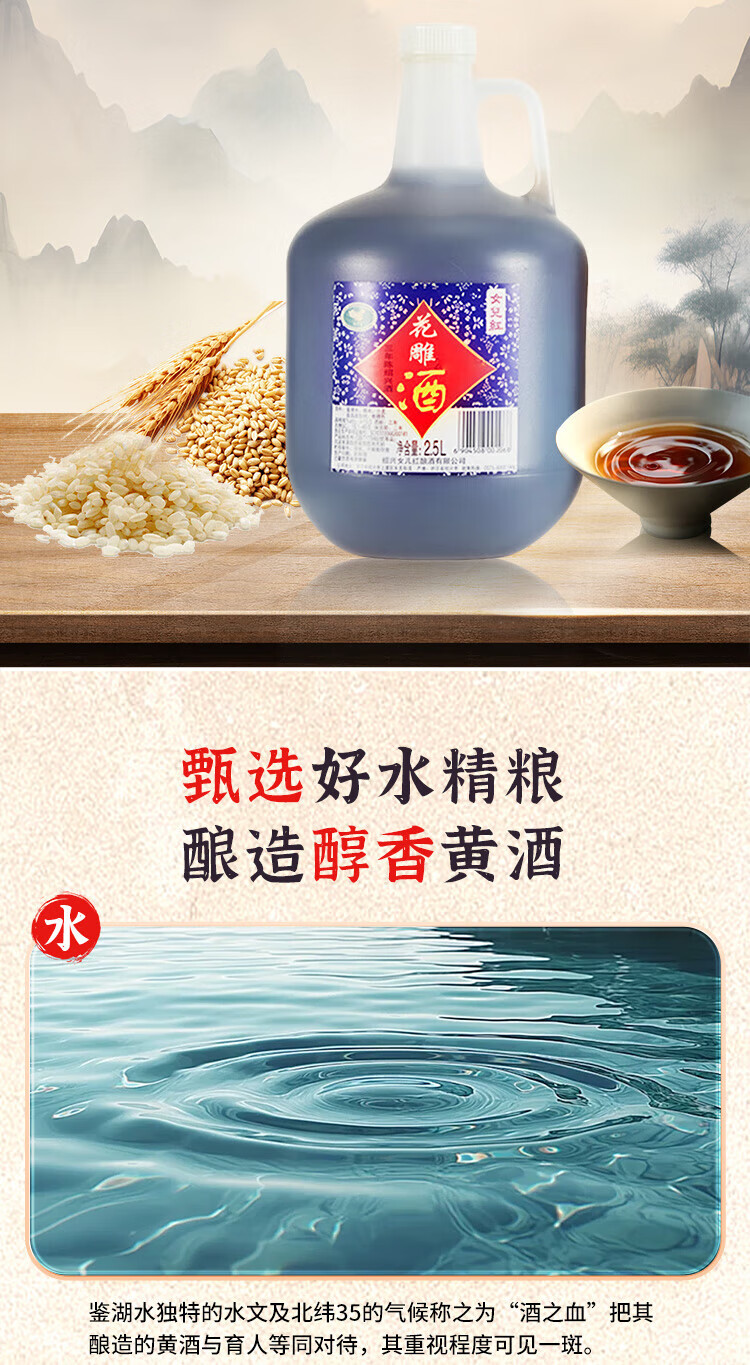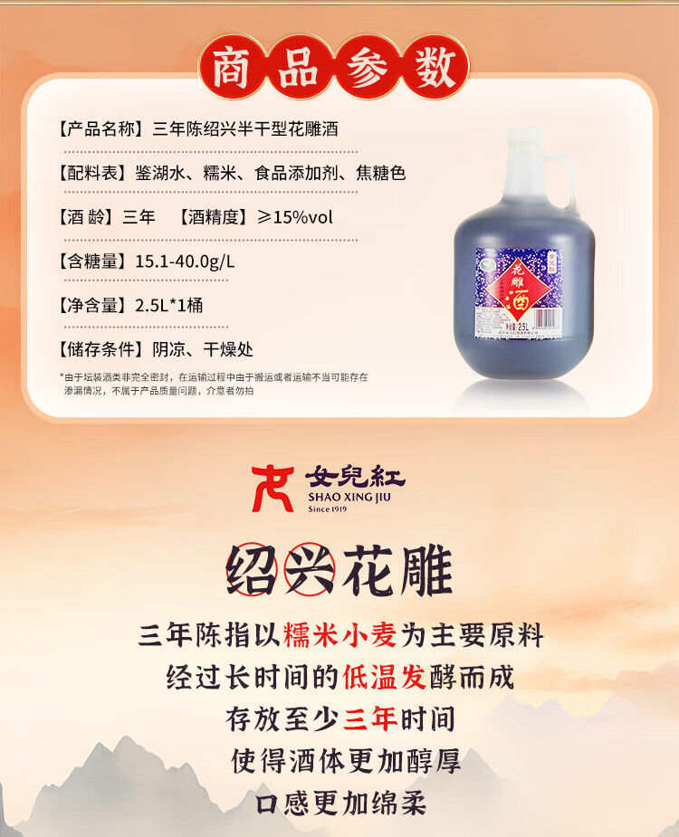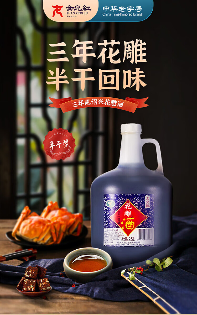 Daughter Red Huadiao Wine Three Years Semi-dry Shade Shaoxing Yellow Wine 2.5L Single Bottle [Mid-Autumn Gift]