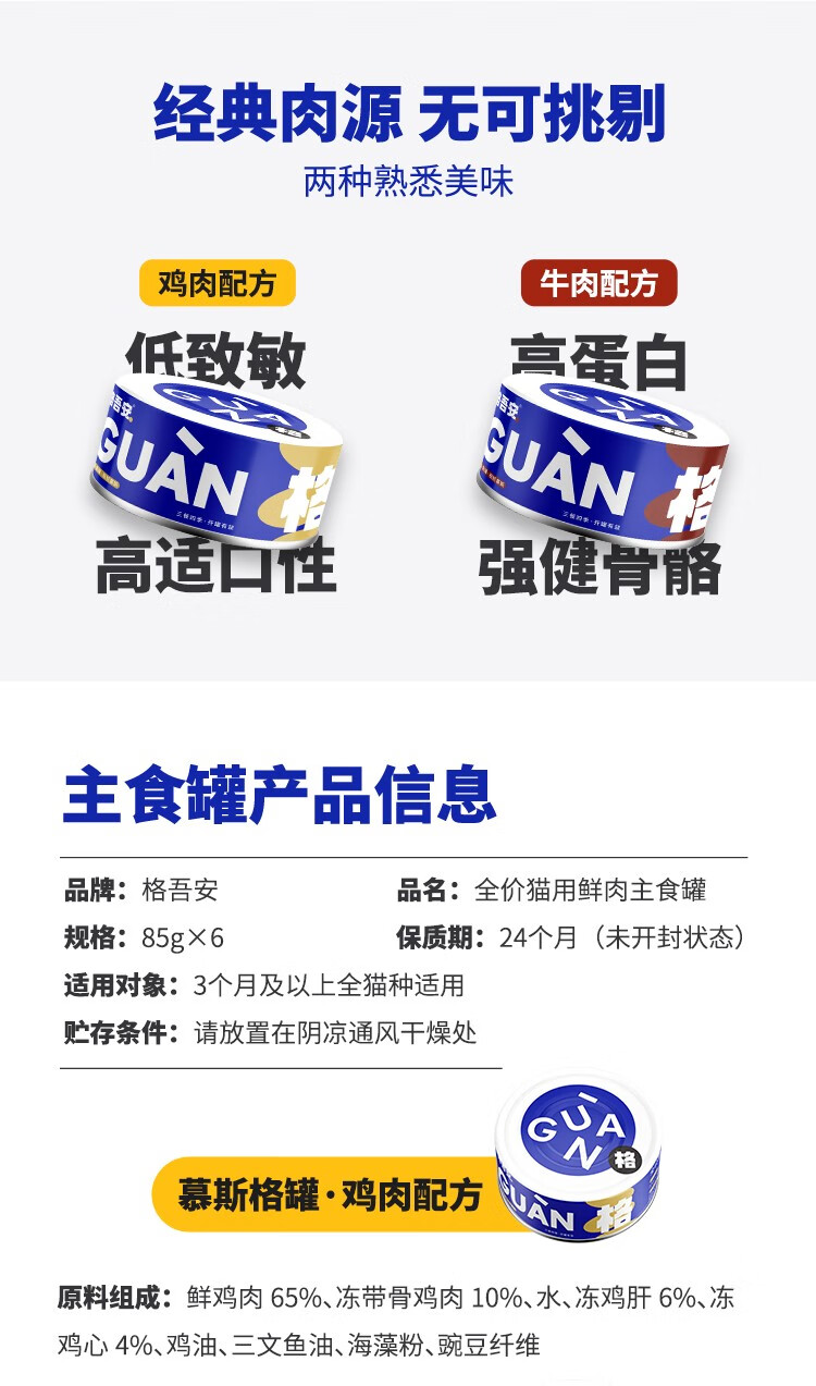 Gewu Ange series cat staple food can full price fresh meat cat wet grain mousse chicken beef shredded chicken mixed flavor Mousse chicken + beef mixed recipe 1 box (85g*6 cans)