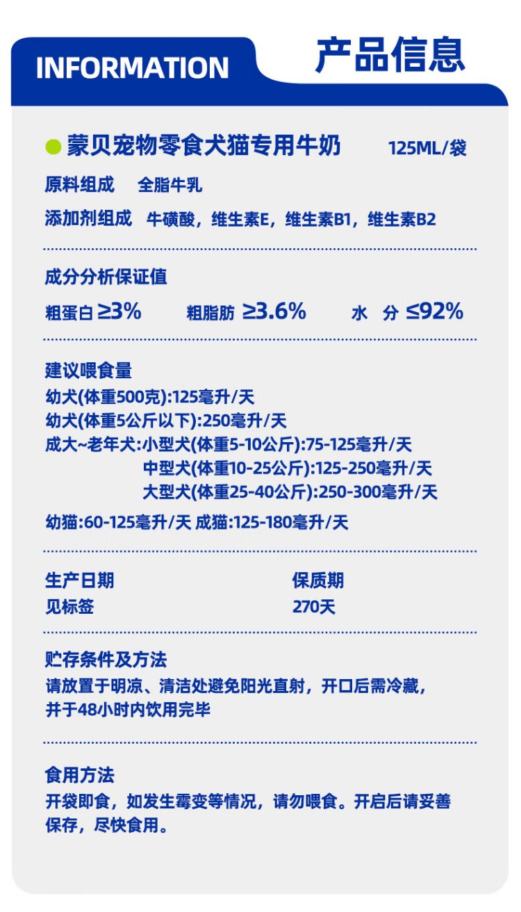 Mengbei pet milk 125ml/bag dog and cat snacks puppies and adults zero lactose nutritional milk 125ml 20 bags original flavor