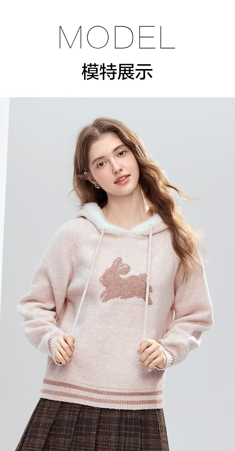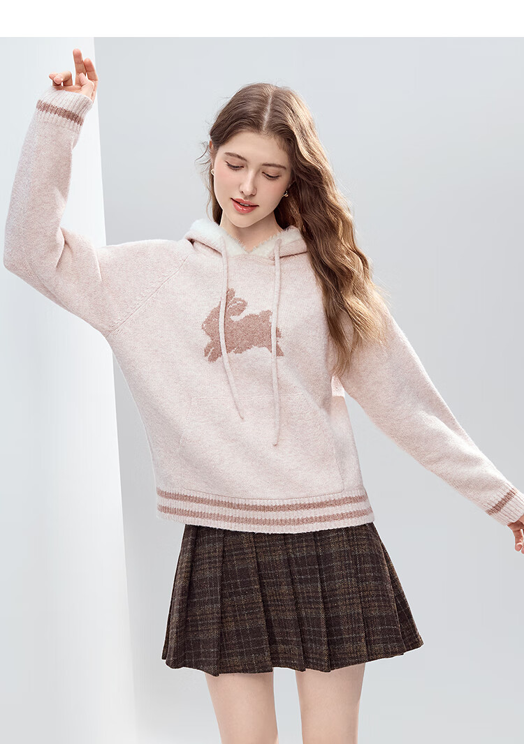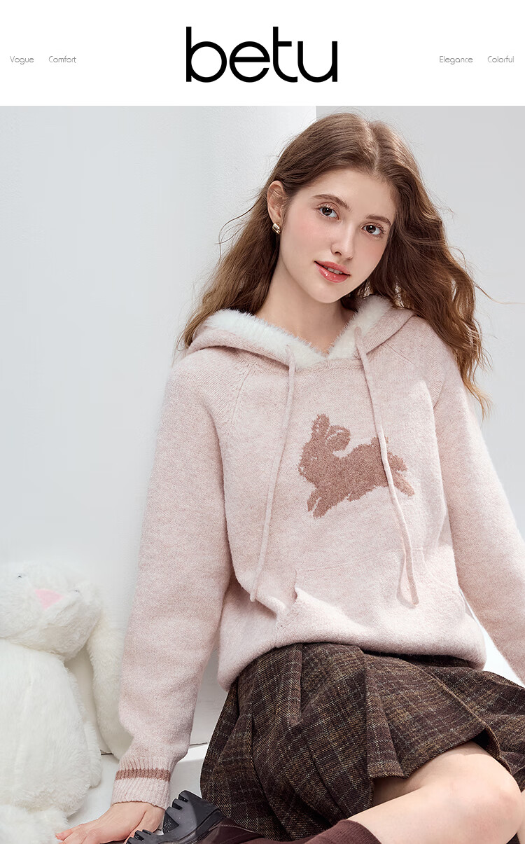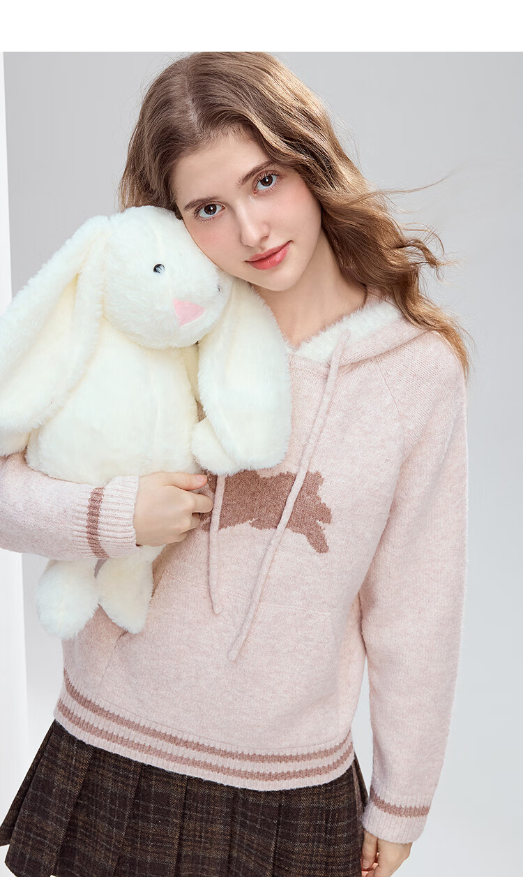 Betu Women's 2025 Winter New Sweater Cute Rabbit Jacquard Fur Hat Mouth Sweet Top Women 2510T52 Light Pink S