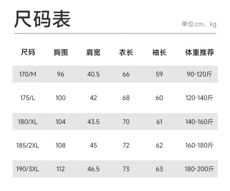 China (cm) 165 / 88-90 170 / 96-98 175 / 108-110 180 / 118-122 185 / 126-130