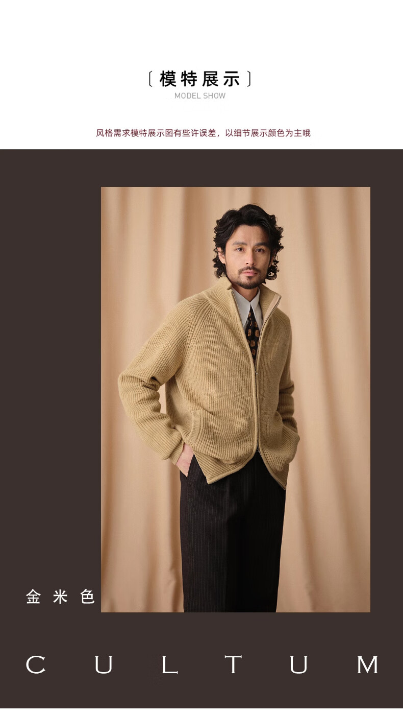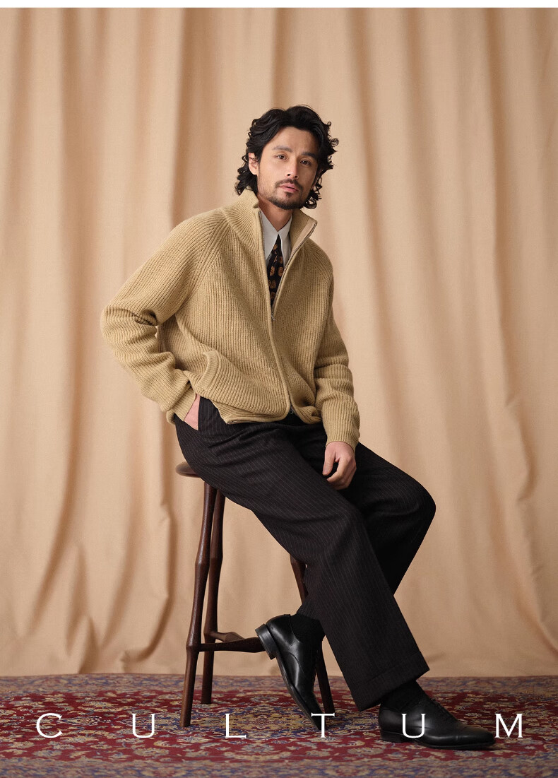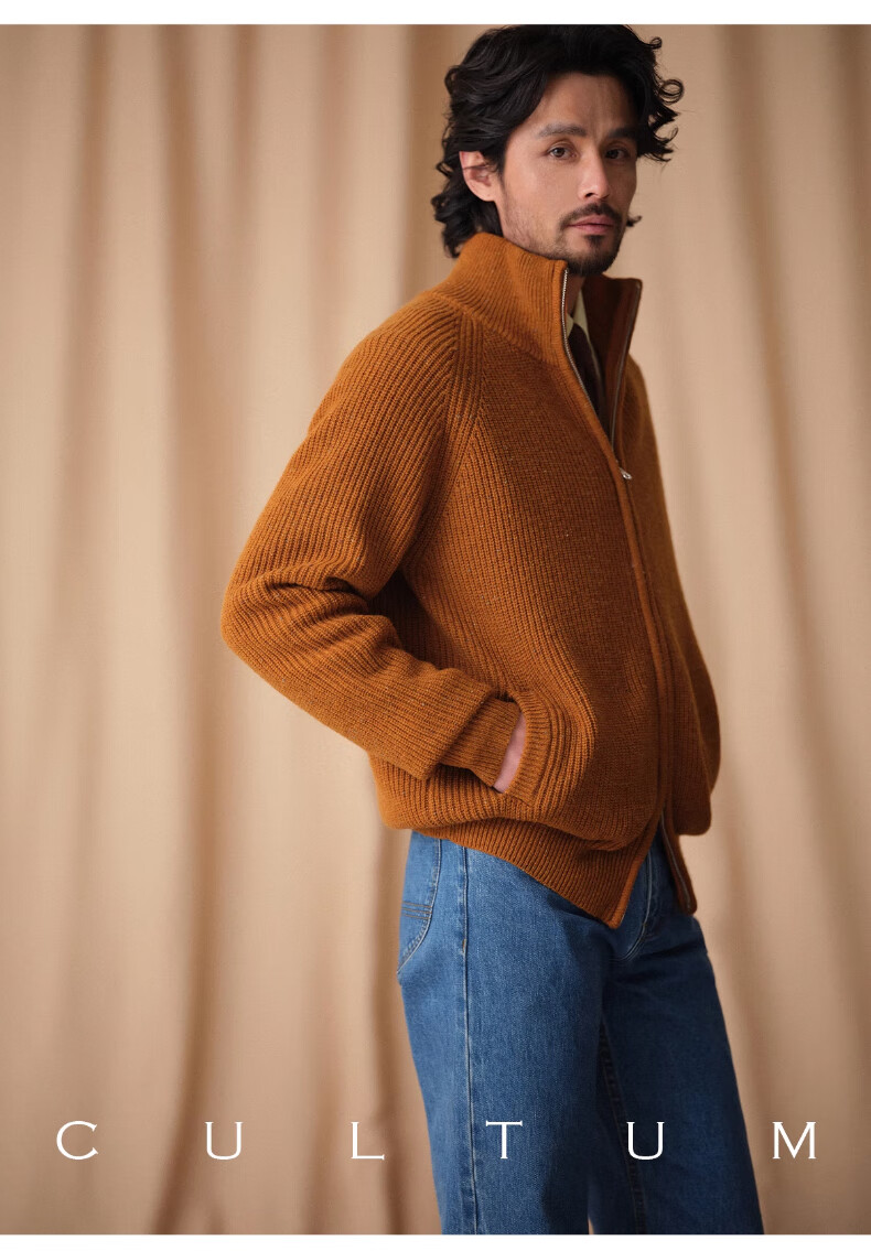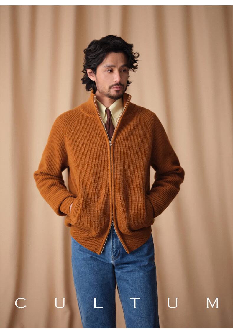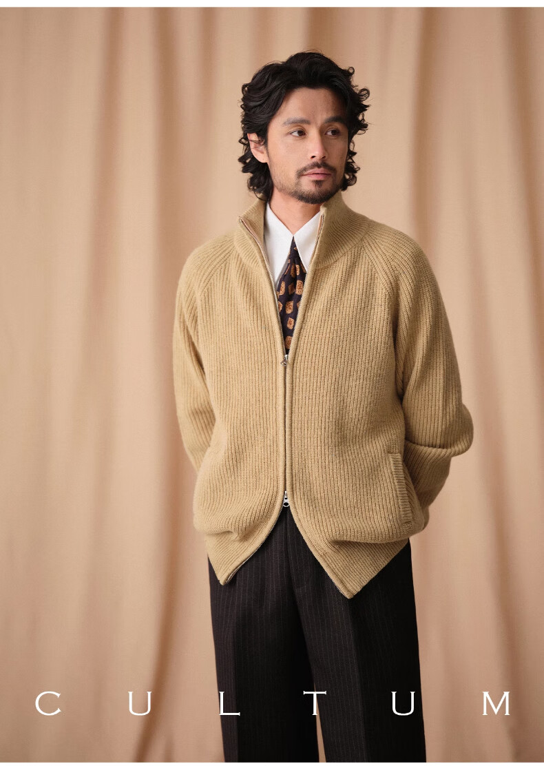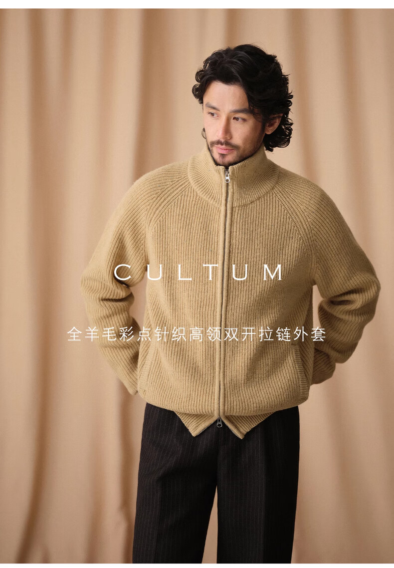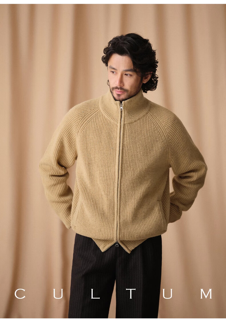 CULTUM winter thickened 100% wool cardigan turtleneck sweater men's top double zipper coat sweater gold beige L