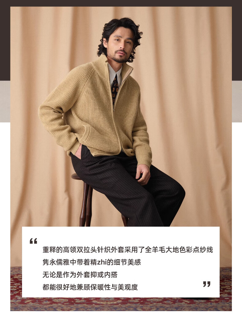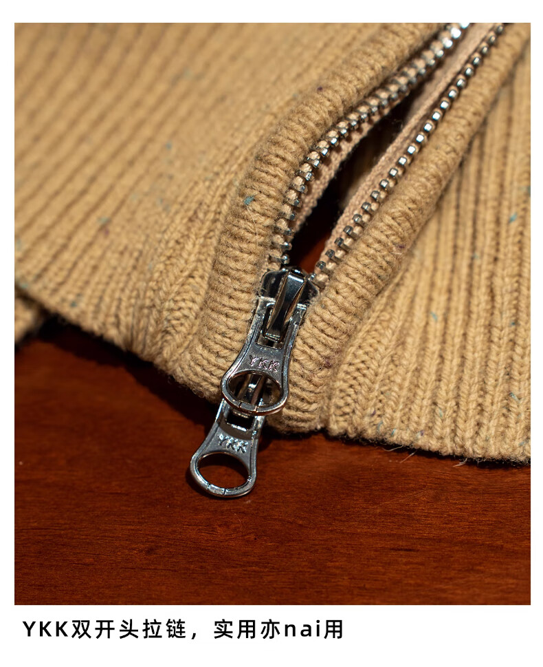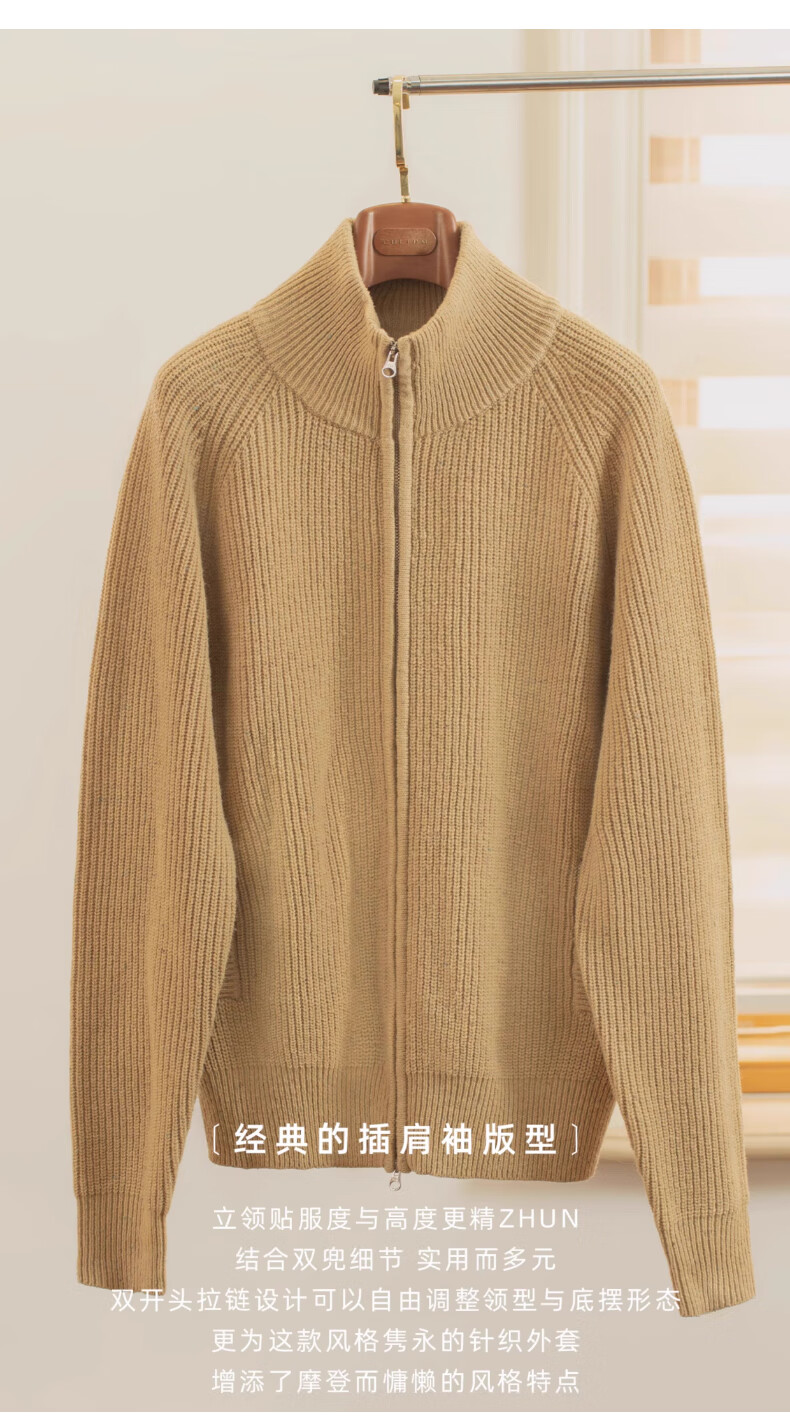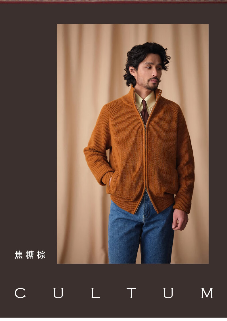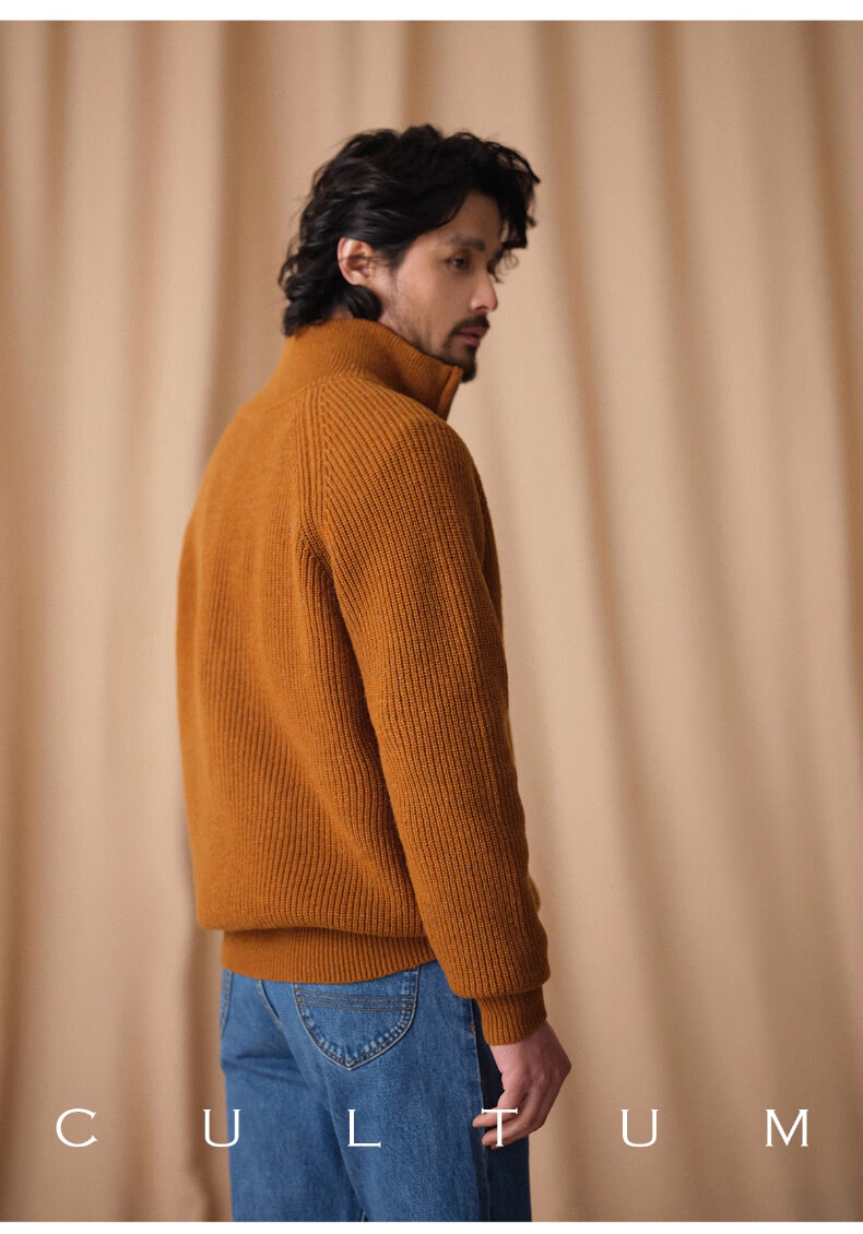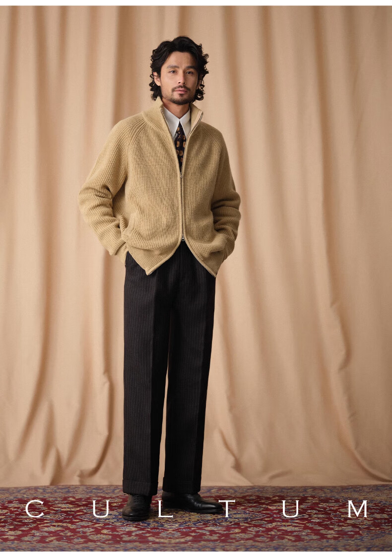 CULTUM winter thickened 100% wool cardigan turtleneck sweater men's top double zipper coat sweater gold beige L