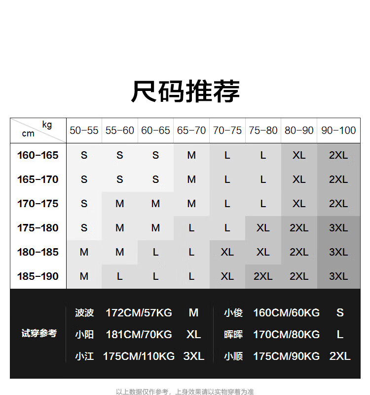 China (cm) 165 / 88-90 170 / 96-98 175 / 108-110 180 / 118-122 185 / 126-130