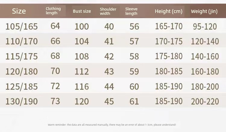 China (cm) 165 / 88-90 170 / 96-98 175 / 108-110 180 / 118-122 185 / 126-130