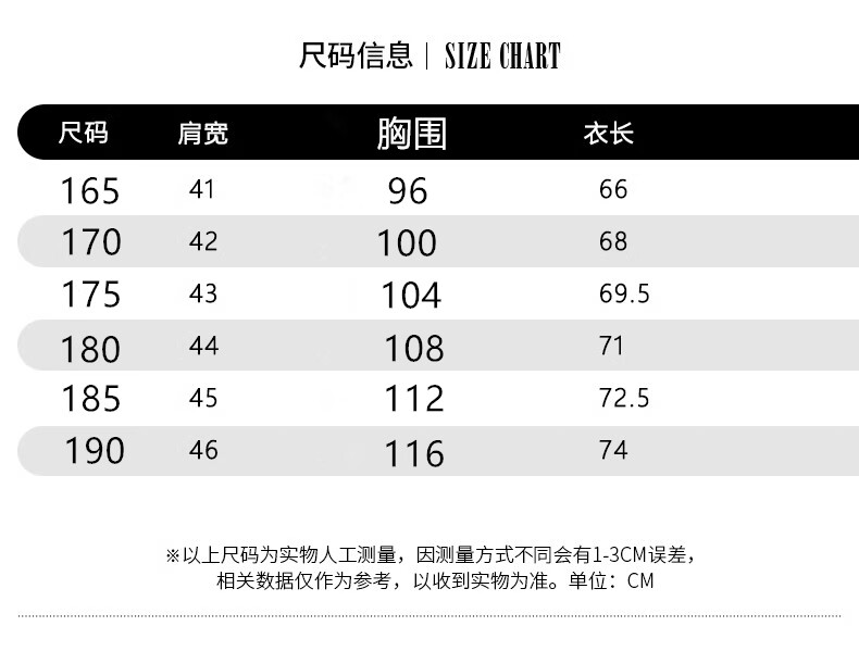 China (cm) 165 / 88-90 170 / 96-98 175 / 108-110 180 / 118-122 185 / 126-130