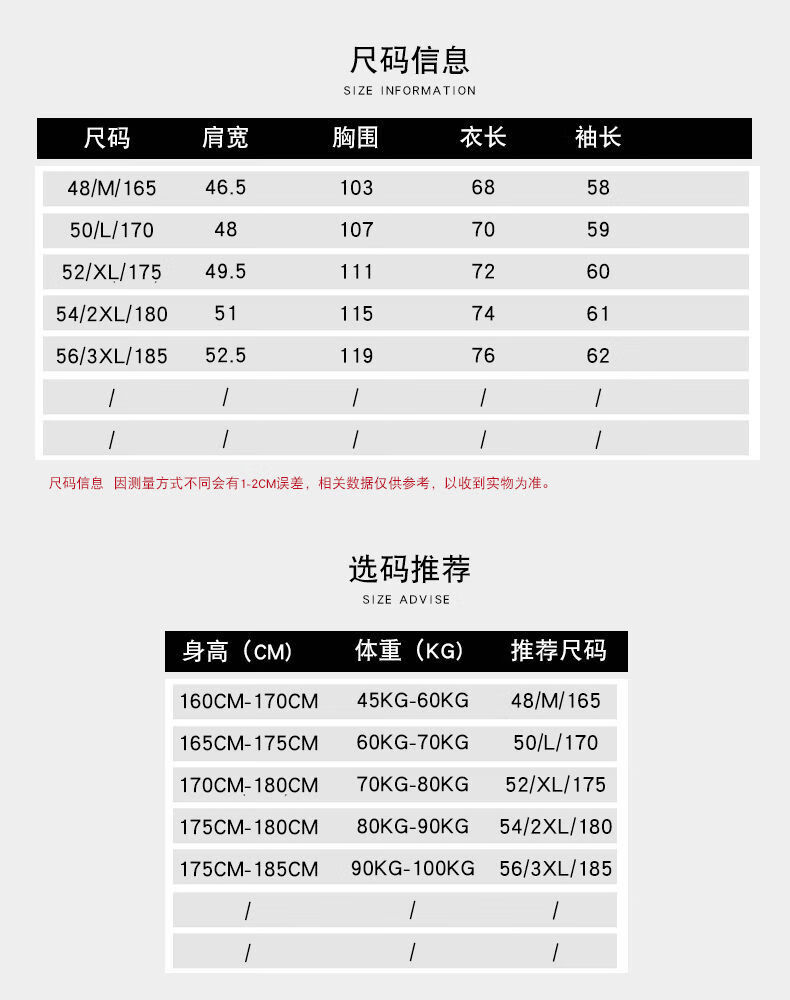 China (cm) 165 / 88-90 170 / 96-98 175 / 108-110 180 / 118-122 185 / 126-130