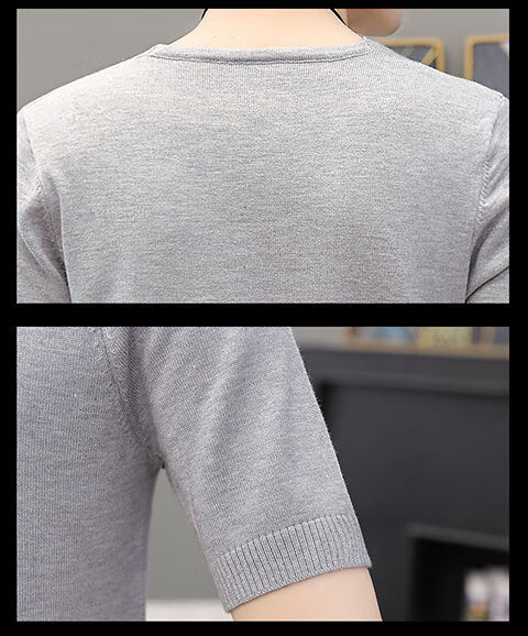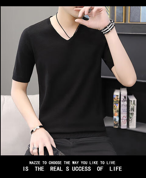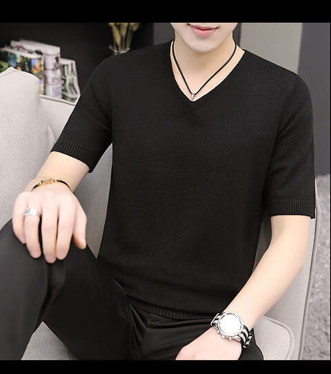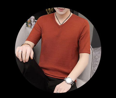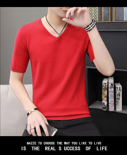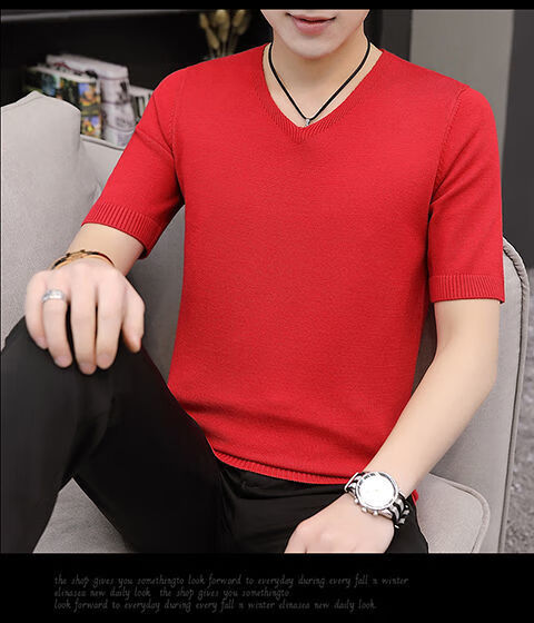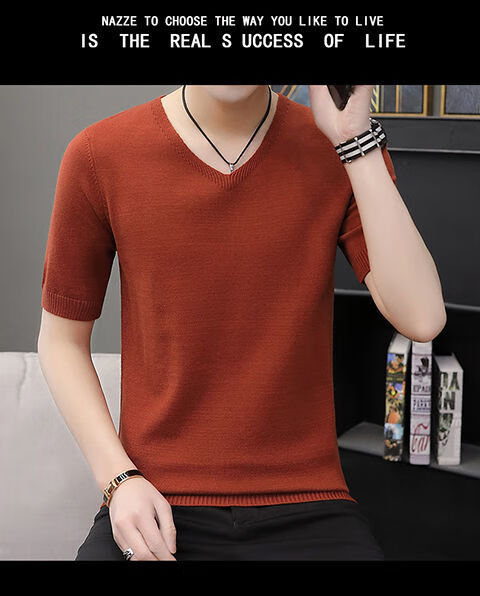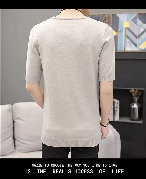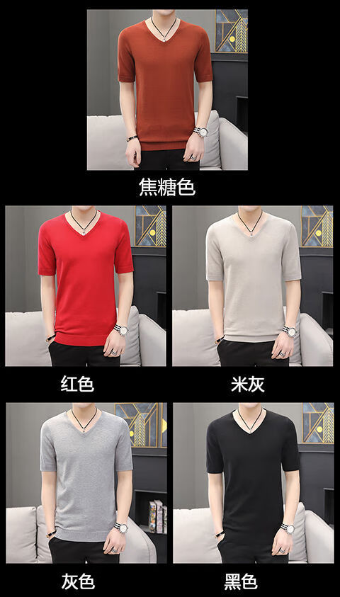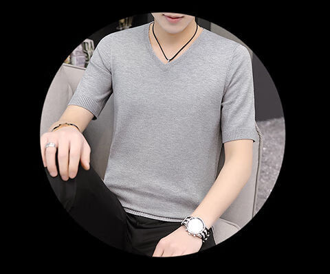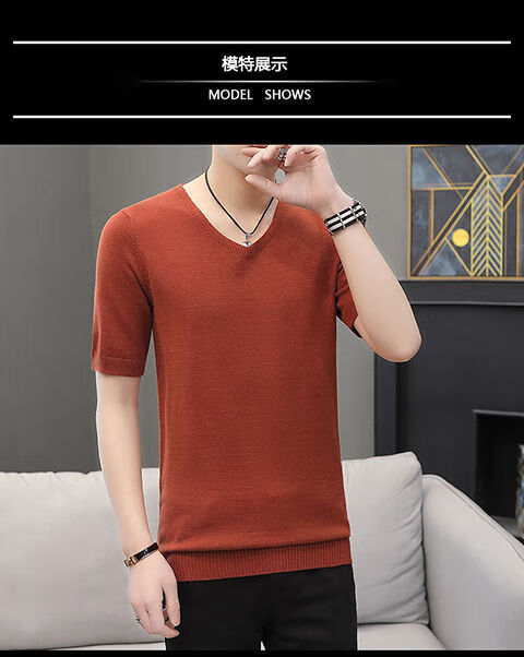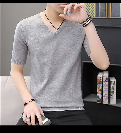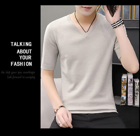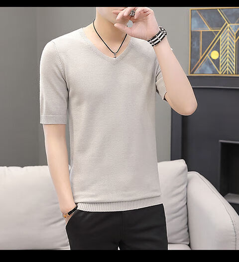 Hengyuanxiang (HYX) autumn and winter slim fit V-neck sheep sweater sweater T-shirt close-fitting men's short-sleeved thin sweater with low collar half-sleeved knitted high-end brand special price broken code beige gray high-end brand special price broken code 2XL