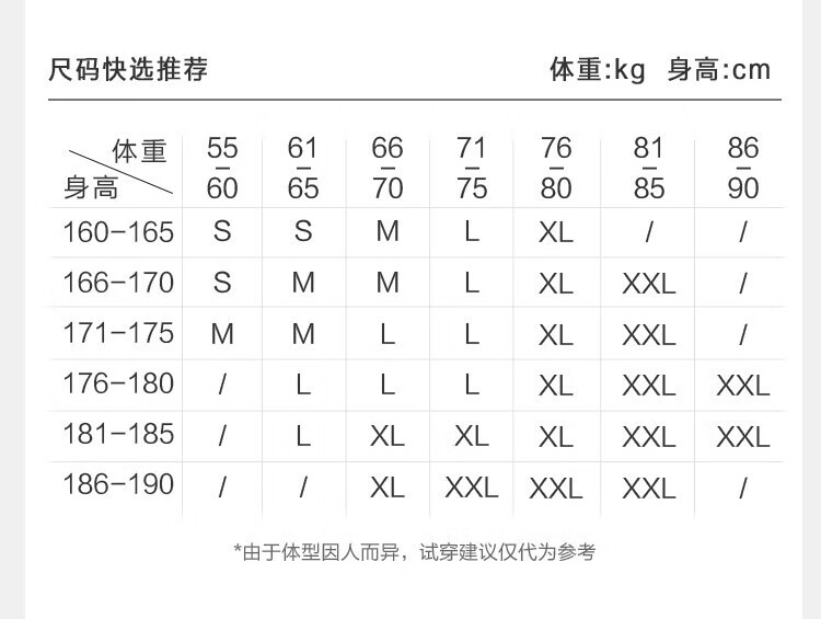 China (cm) 160-165/84-86 165-170 / 88-90 167-172 / 92-96 168-173 / 98-102 170-176 / 106-110