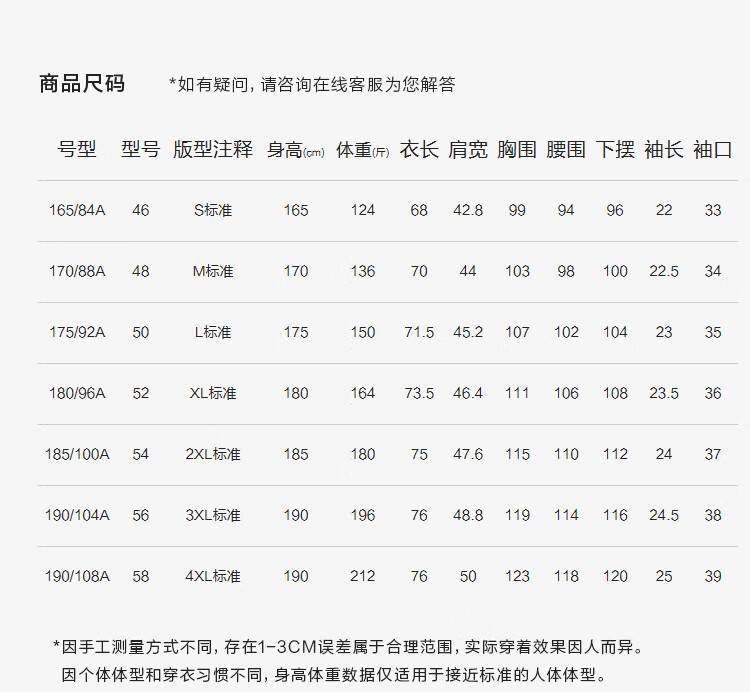 China (cm) 160-165/84-86 165-170 / 88-90 167-172 / 92-96 168-173 / 98-102 170-176 / 106-110