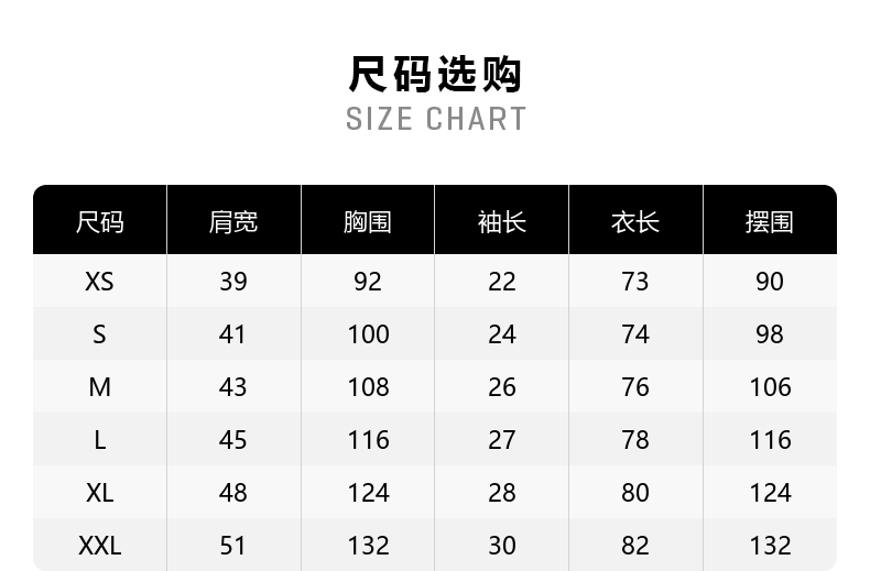 China (cm) 165 / 88-90 170 / 96-98 175 / 108-110 180 / 118-122 185 / 126-130