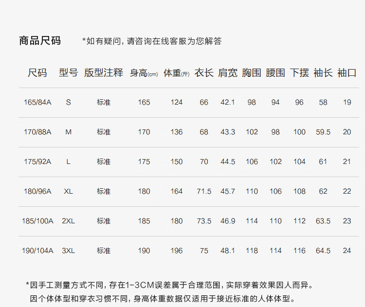 China (cm) 165 / 88-90 170 / 96-98 175 / 108-110 180 / 118-122 185 / 126-130