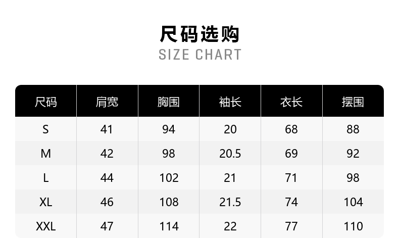 China (cm) 160-165/84-86 165-170 / 88-90 167-172 / 92-96 168-173 / 98-102 170-176 / 106-110