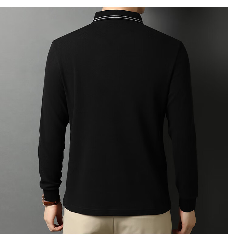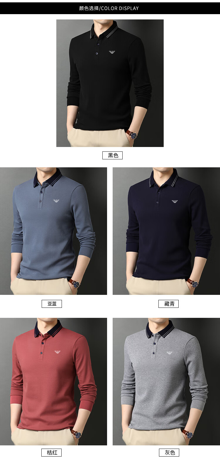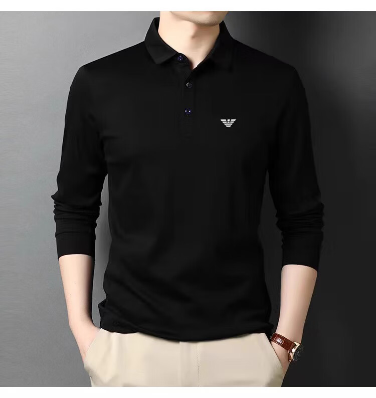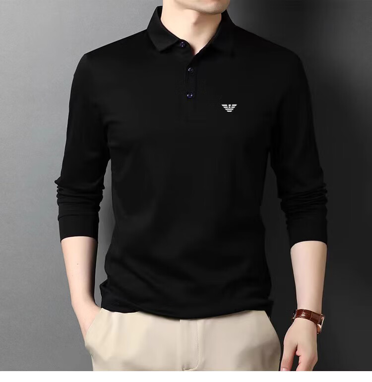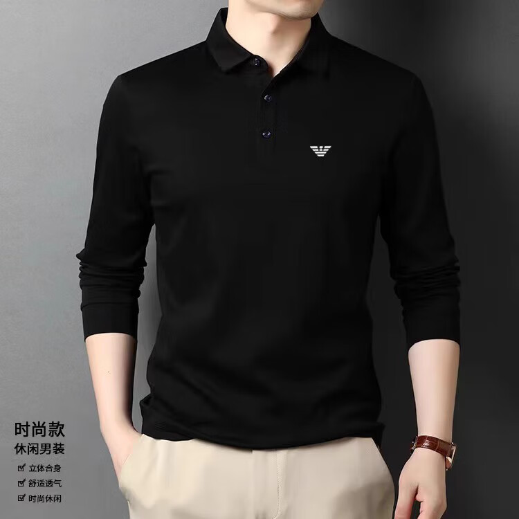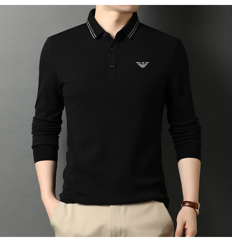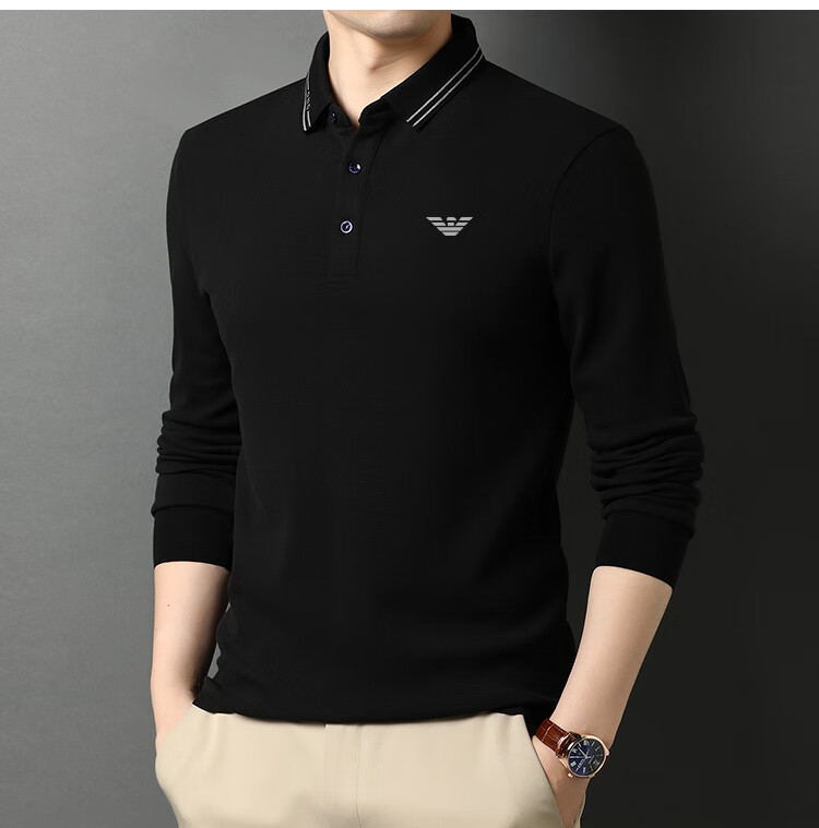Falai Armani high-end long-sleeved T-shirt men's pure cotton lapel autumn casual business plus velvet warm polo shirt 55155 black L 175/92A suitable for 140-160Jin Jin equals 0.5 kg