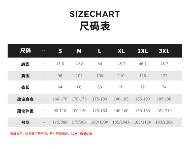 China (cm) 165 / 88-90 170 / 96-98 175 / 108-110 180 / 118-122 185 / 126-130