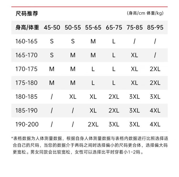 China (cm) 160-165/84-86 165-170 / 88-90 167-172 / 92-96 168-173 / 98-102 170-176 / 106-110