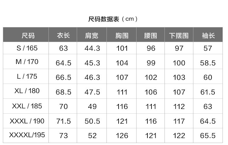 China (cm) 165 / 88-90 170 / 96-98 175 / 108-110 180 / 118-122 185 / 126-130