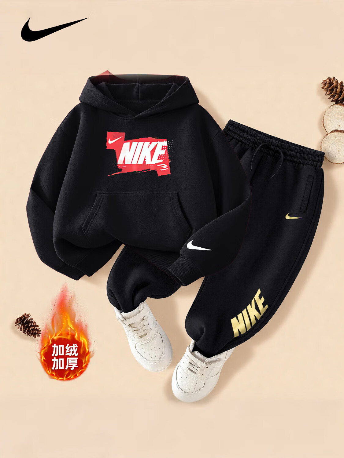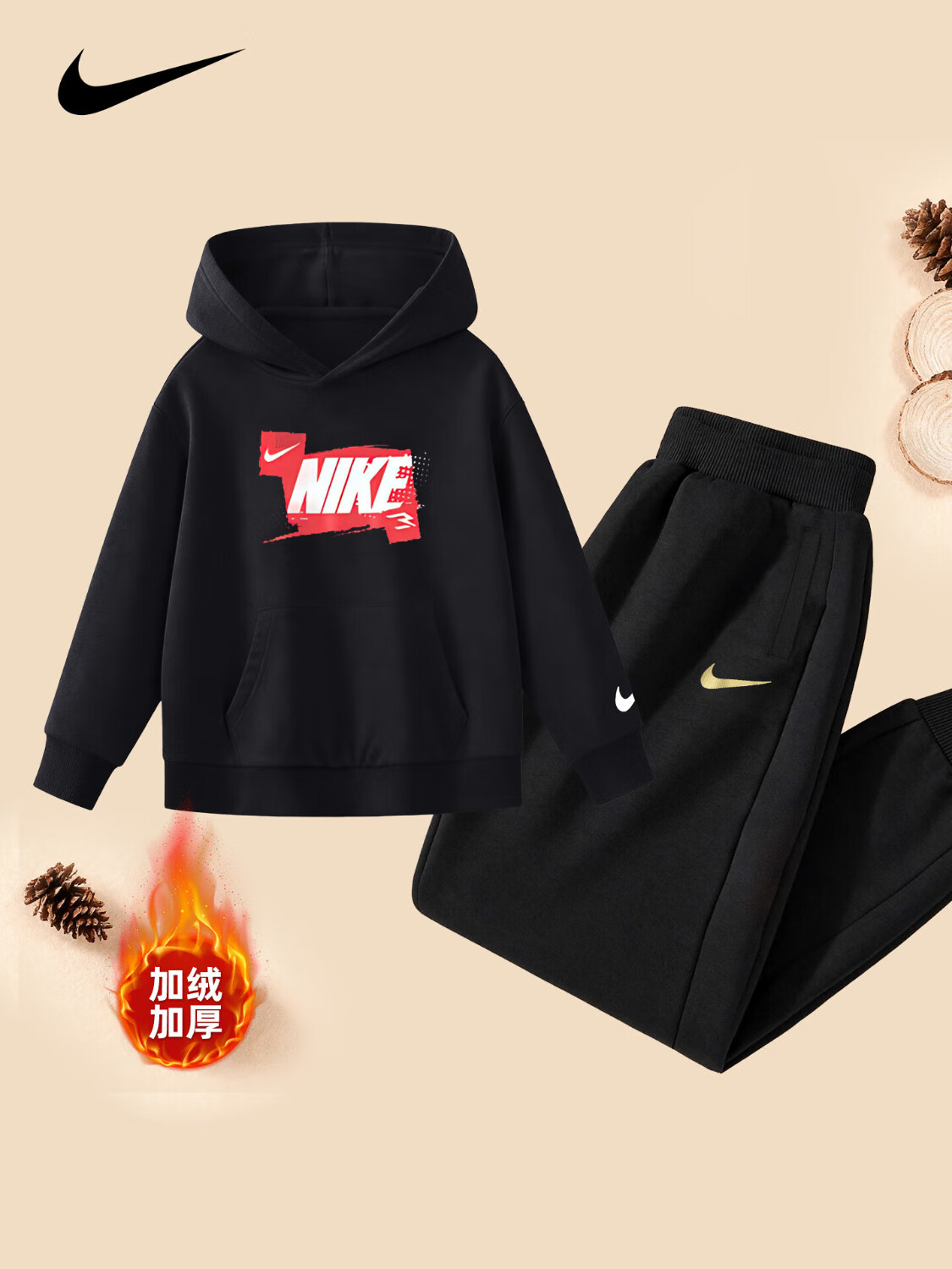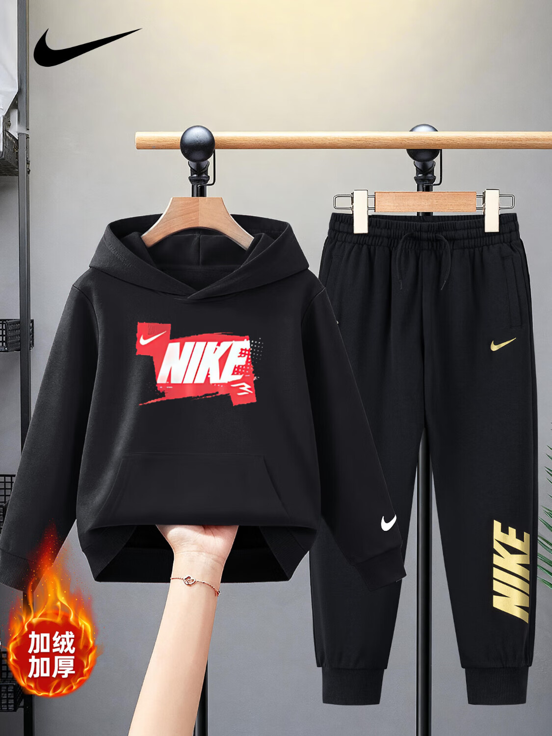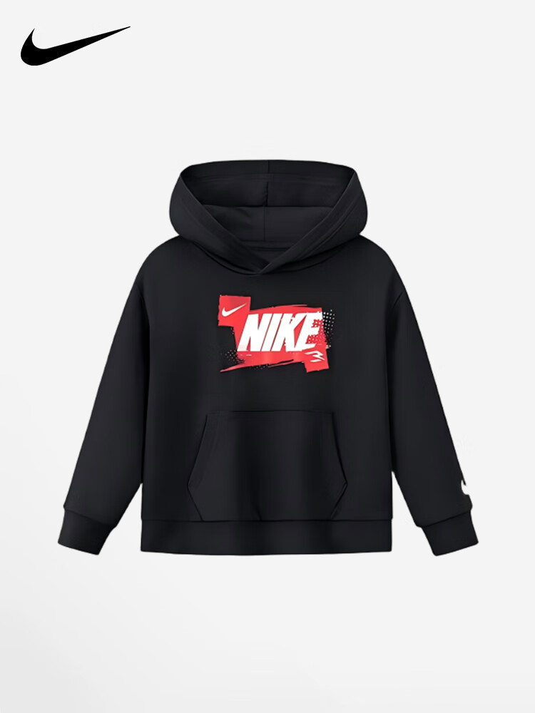 NIKE Nike Girls Sports Suit Plus Velvet Hooded 2025 New Autumn and Winter Boys Cotton Two-Piece Suit Children's Thickened College Red 2236 Autumn and Winter Velvet Style High Weight 160/L Recommended Height 152-158cm
