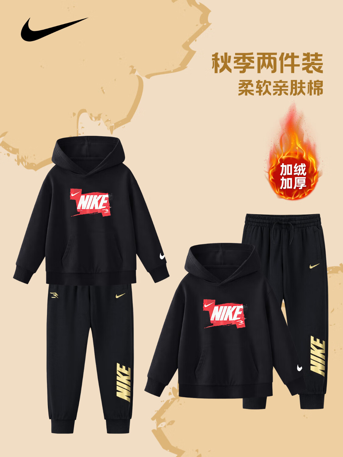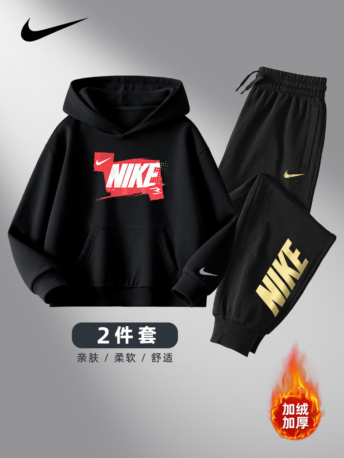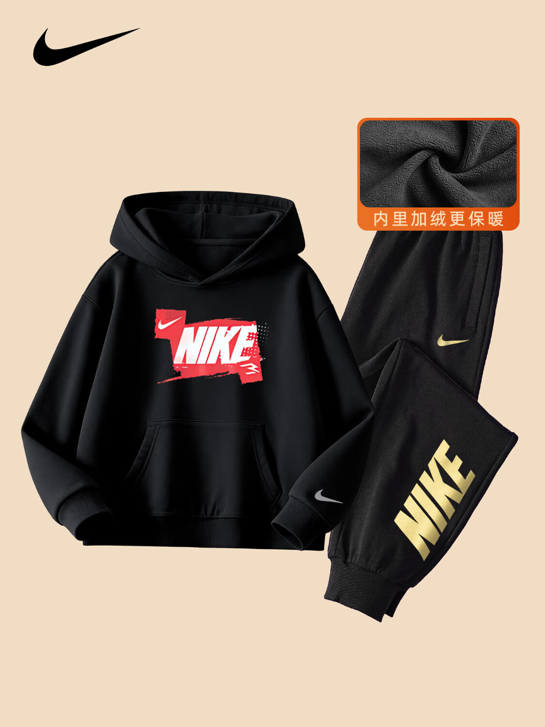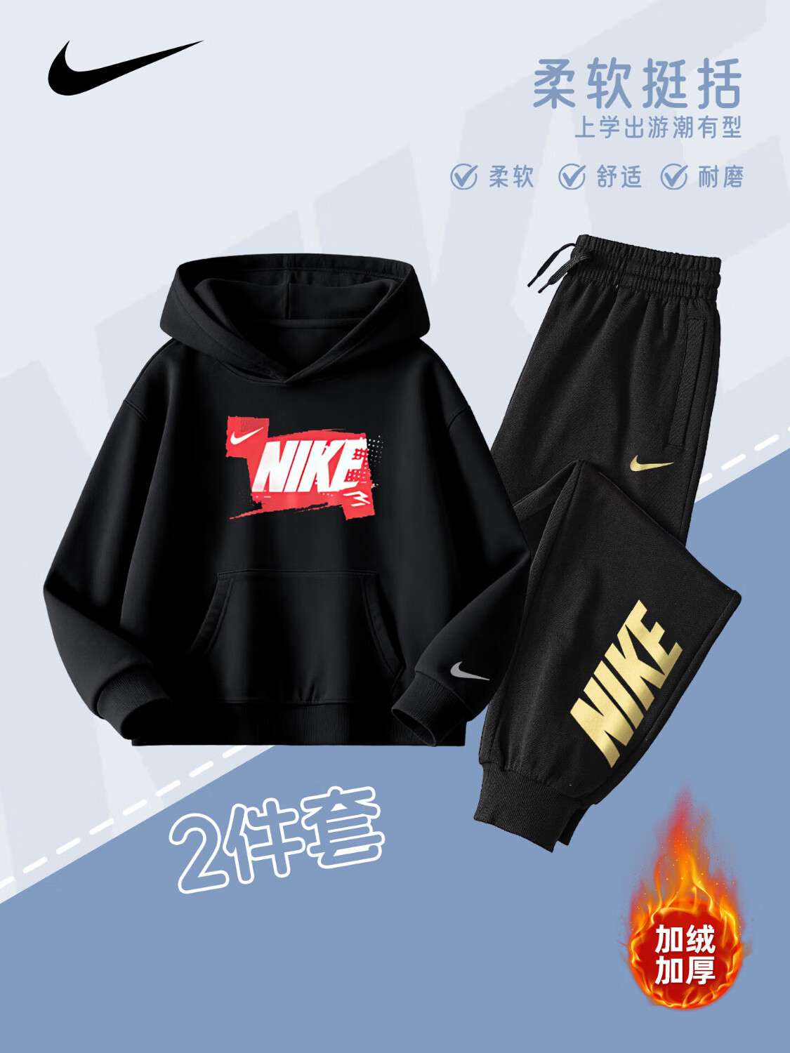 NIKE Nike Girls Sports Suit Plus Velvet Hooded 2025 New Autumn and Winter Boys Cotton Two-Piece Suit Children's Thickened College Red 2236 Autumn and Winter Velvet Style High Weight 160/L Recommended Height 152-158cm