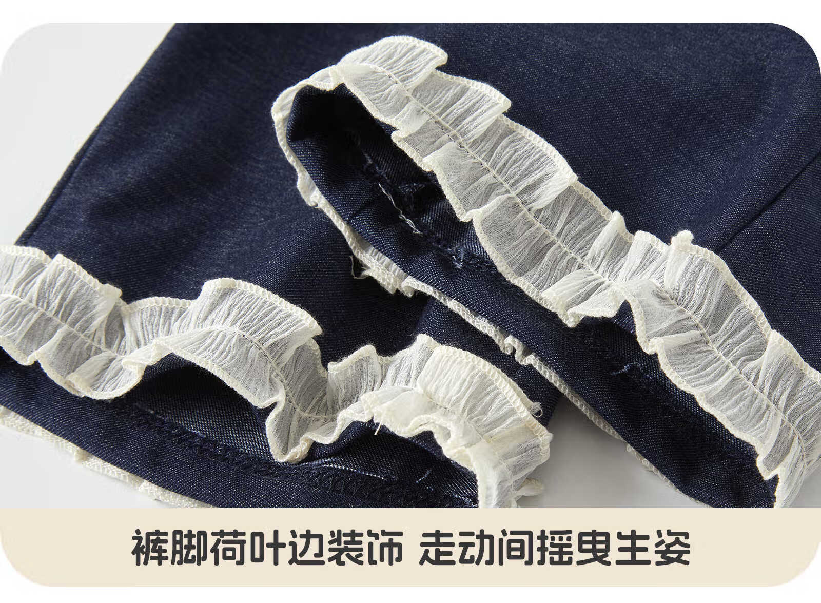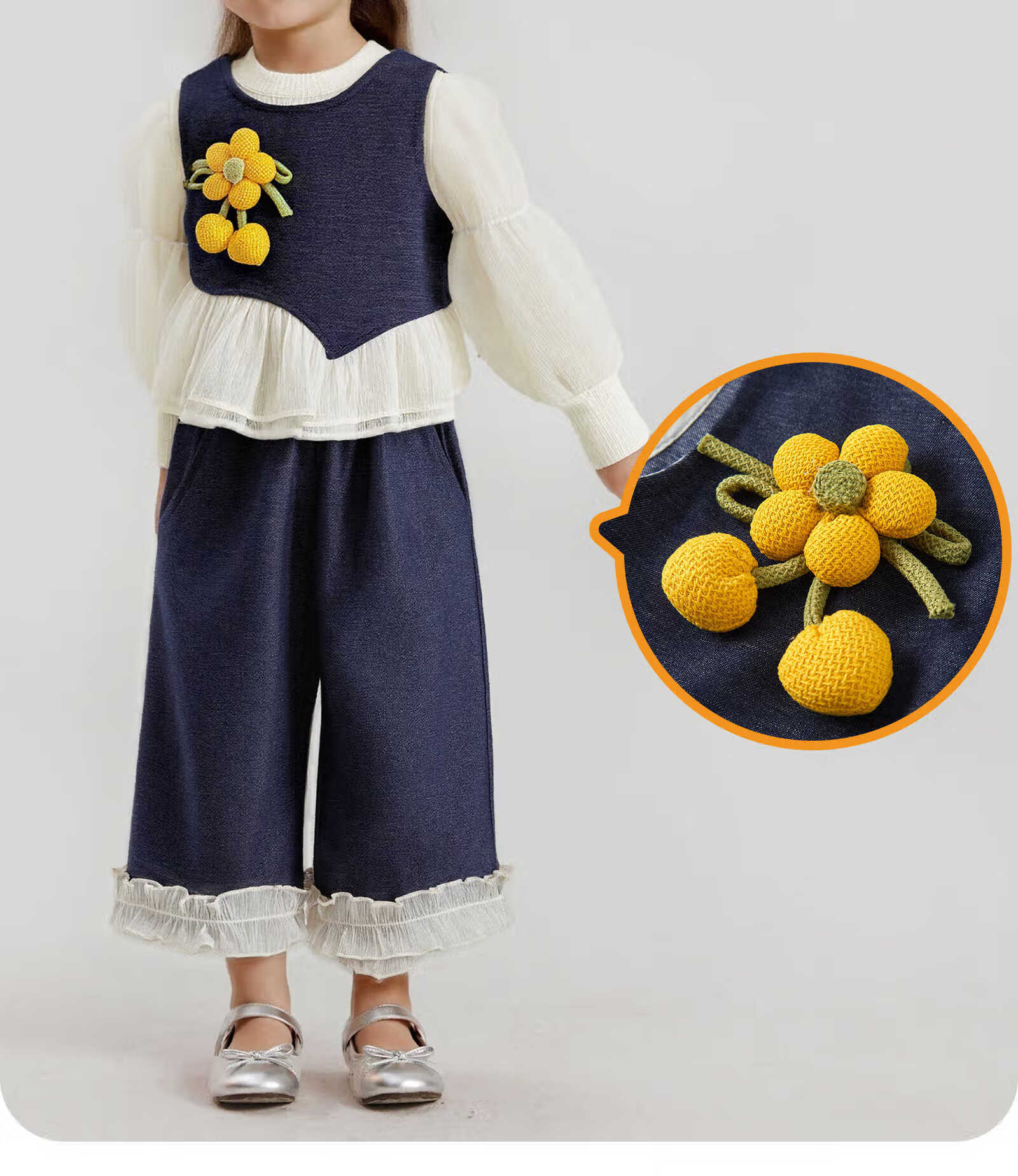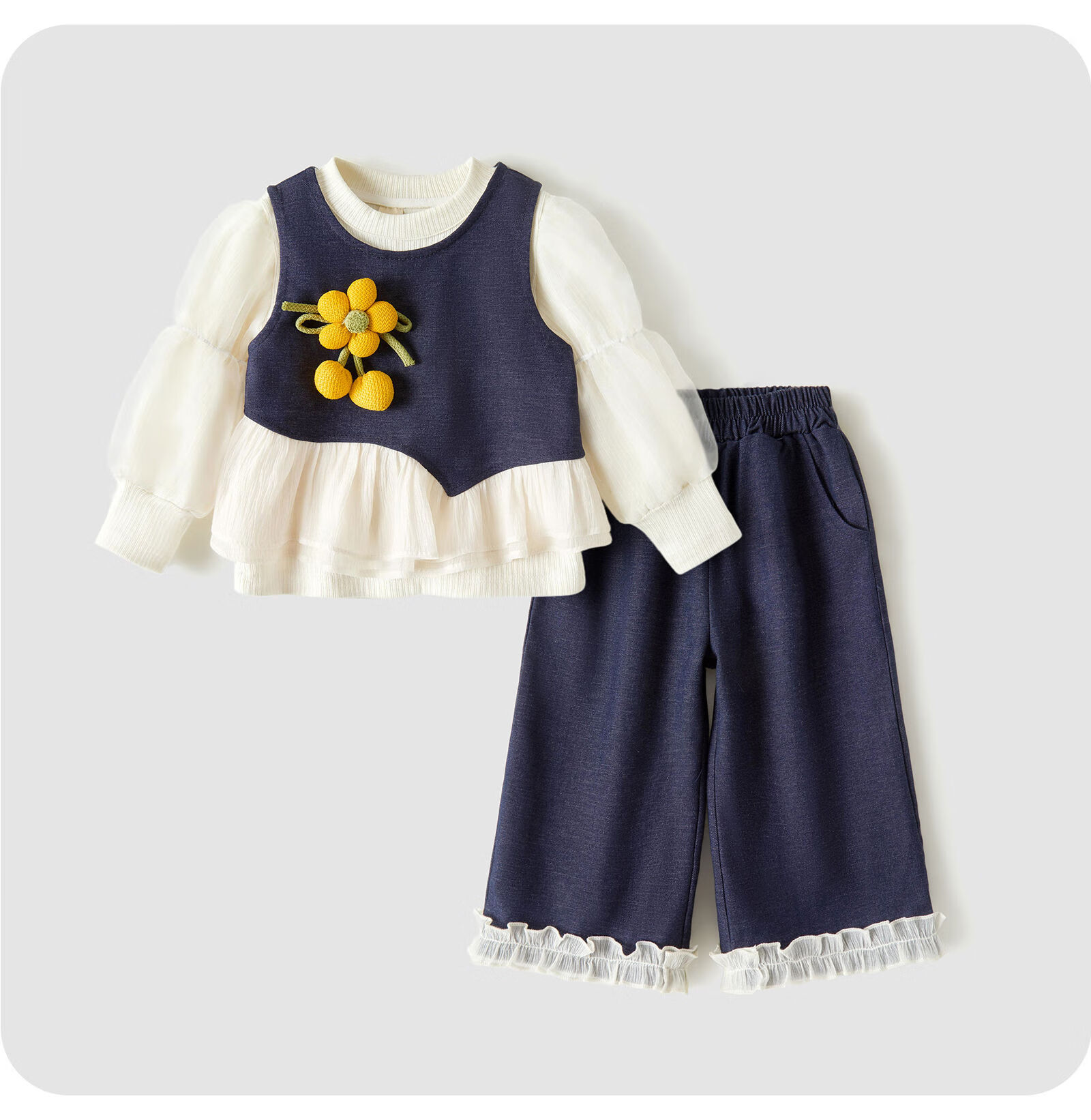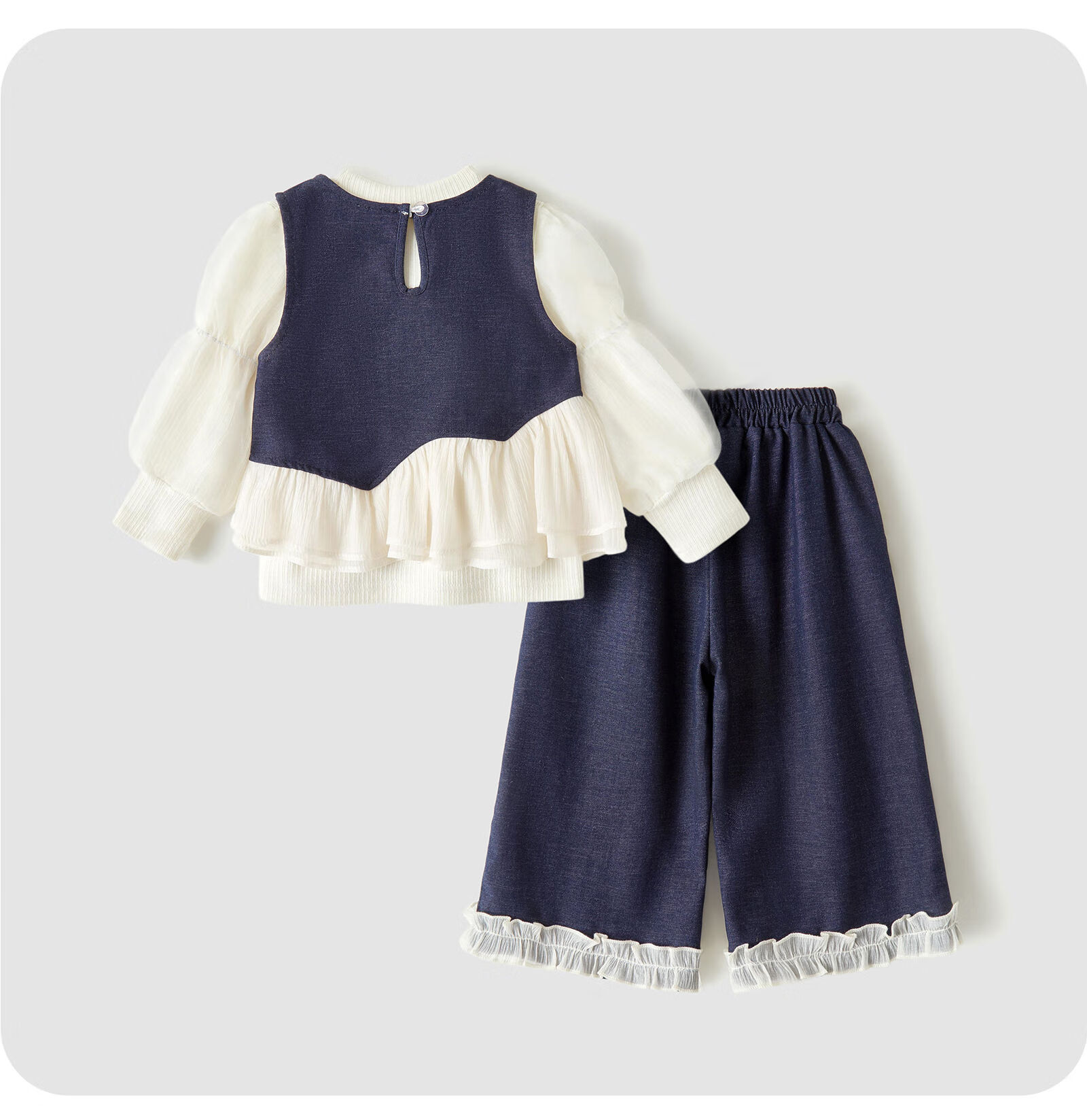 Keying GOWINBABY Girls Suit French 2025 Autumn New Baby Girl Sweet and Cute Autumn Clothes Little Girl Cartoon Lace Three-piece Set Apricot Lace Bottoming Shirt + Blue Vest Set 140 (Suitable for Height 130cm-140cm)