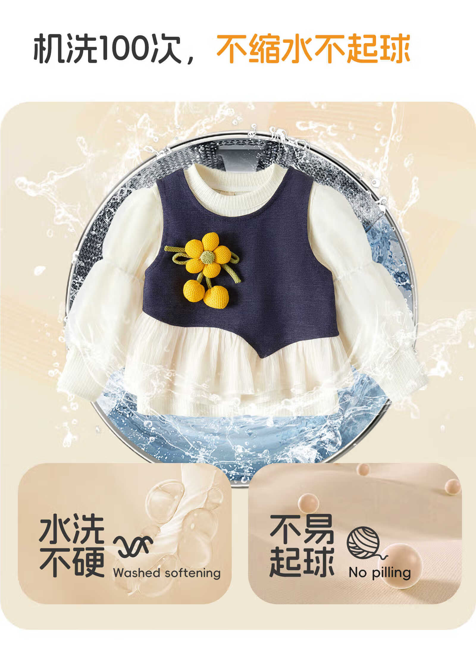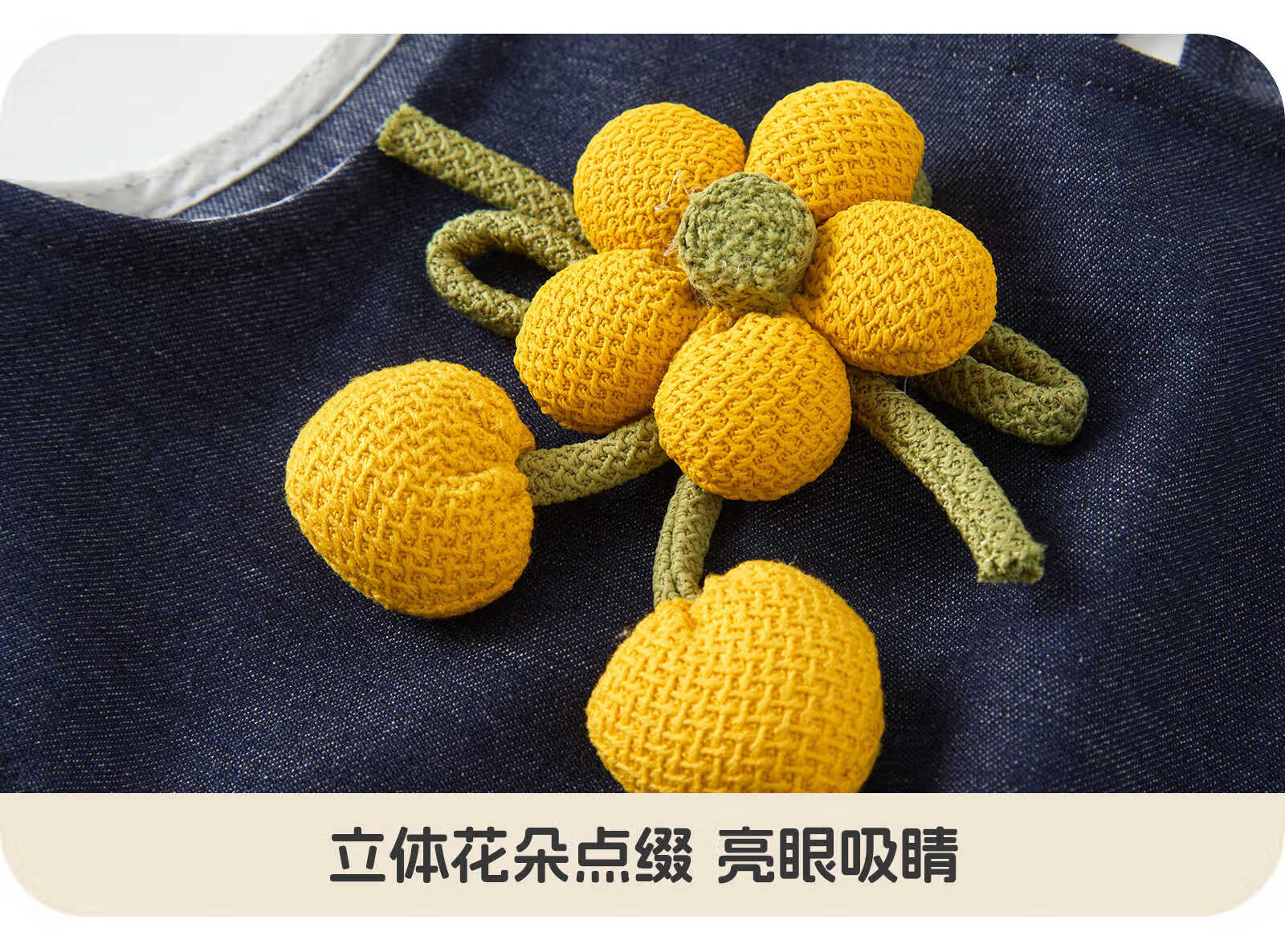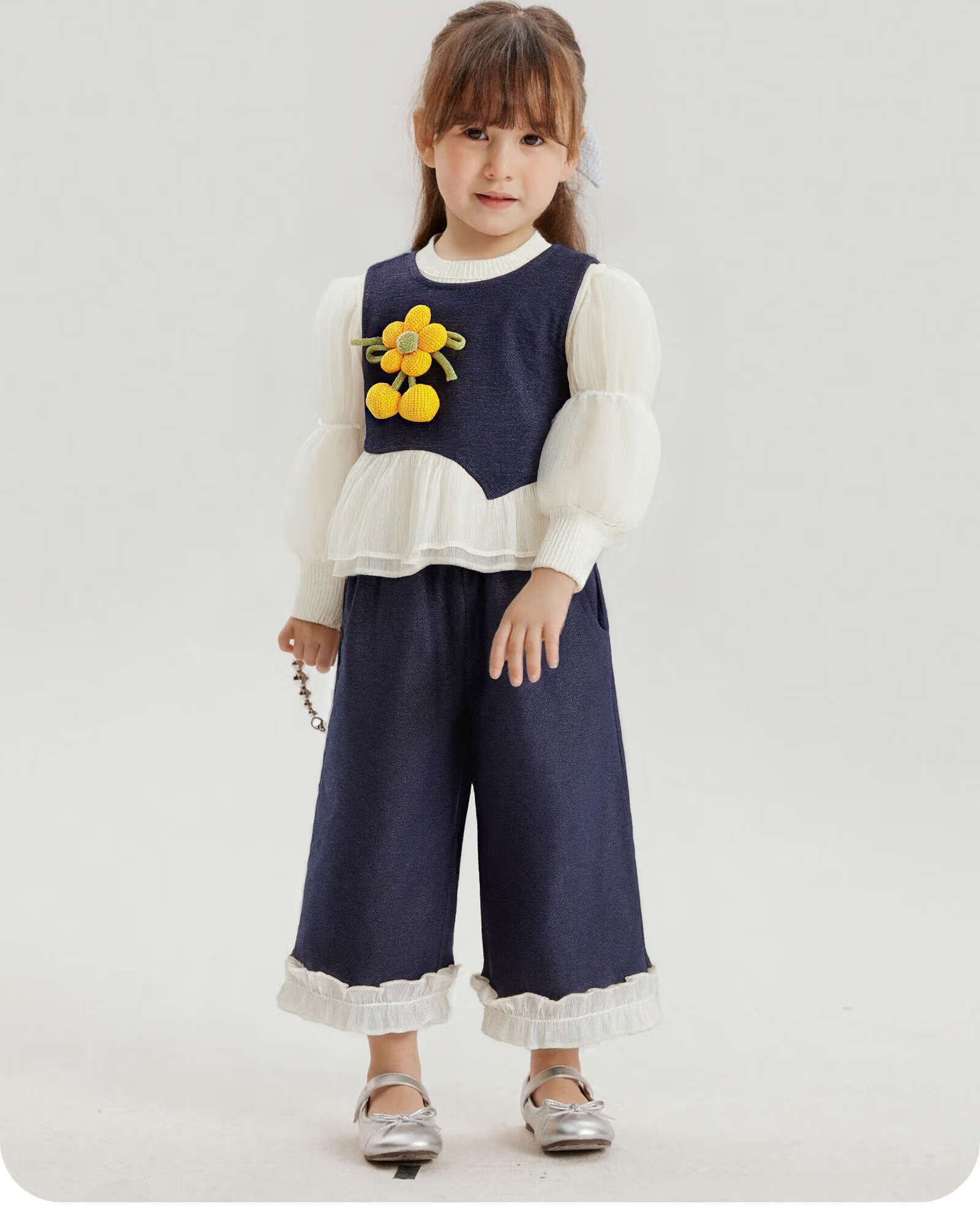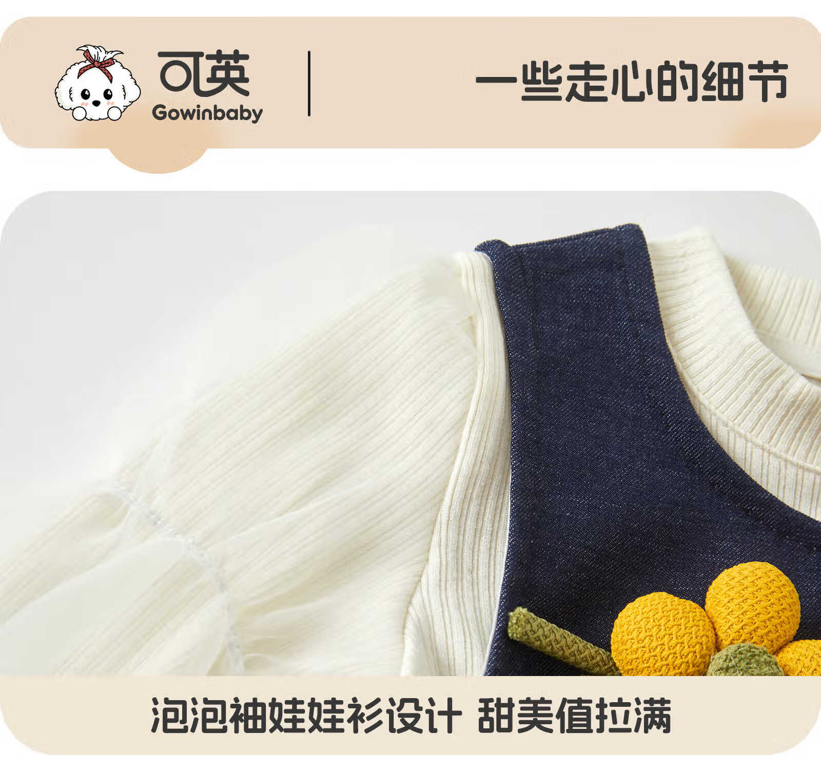 Keying GOWINBABY Girls Suit French 2025 Autumn New Baby Girl Sweet and Cute Autumn Clothes Little Girl Cartoon Lace Three-piece Set Apricot Lace Bottoming Shirt + Blue Vest Set 140 (Suitable for Height 130cm-140cm)