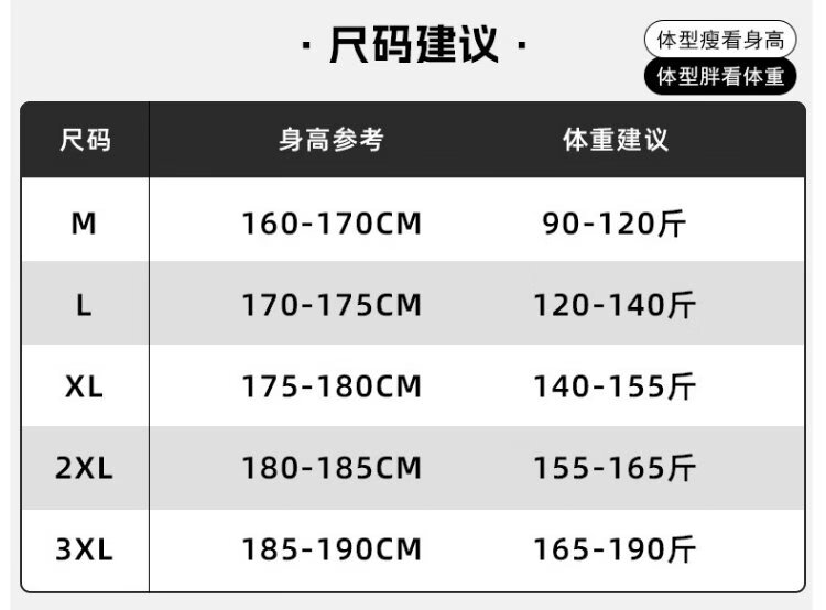 China (cm) 165 / 88-90 170 / 96-98 175 / 108-110 180 / 118-122 185 / 126-130